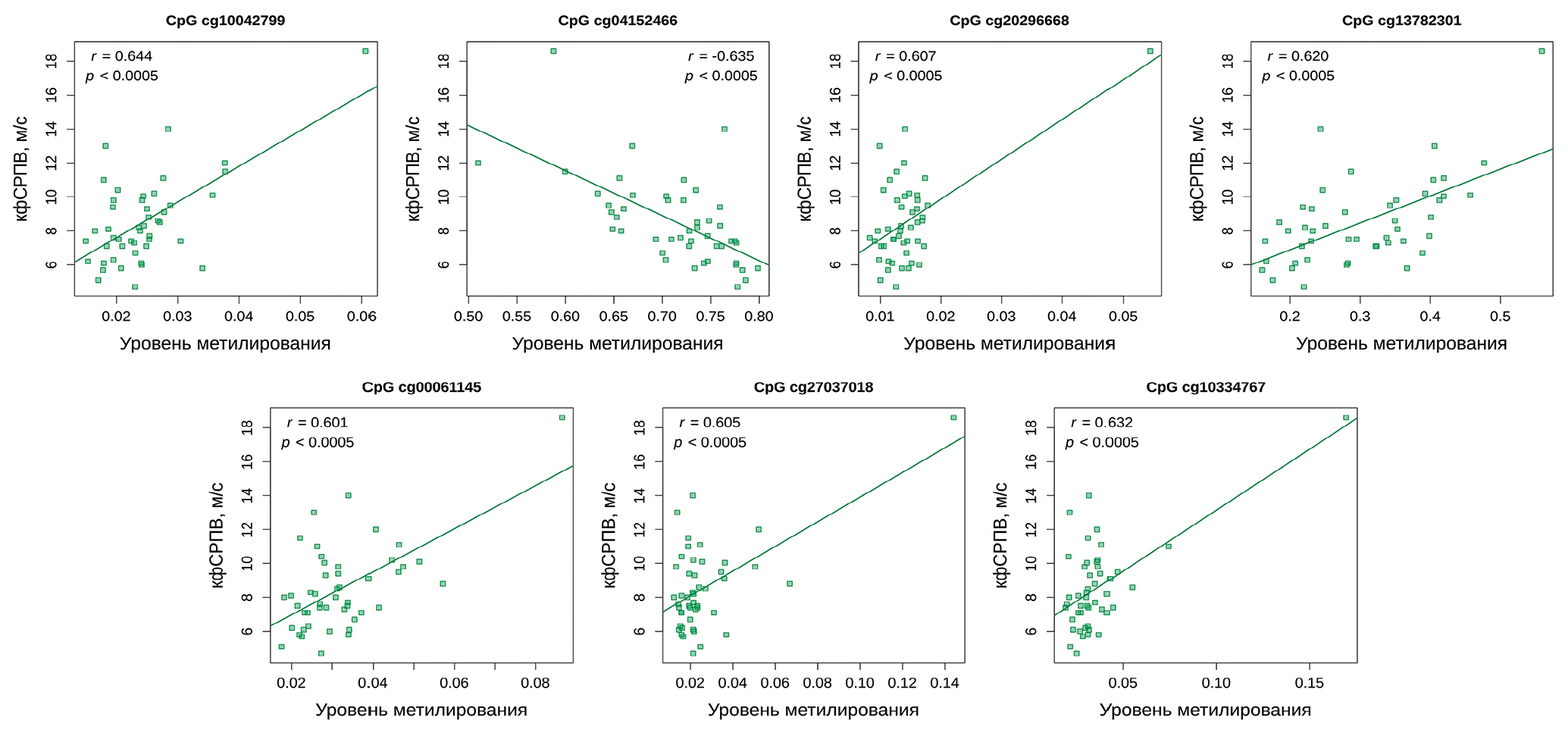 Рис. 3. Связь между кфСРПВ и уровнем метилирования отдельных CpG-сайтов (n = 48). Уровни метилирования ДНК оценивали с использованием технологии Illumina Infinium MethylationEPIC BeadChip.