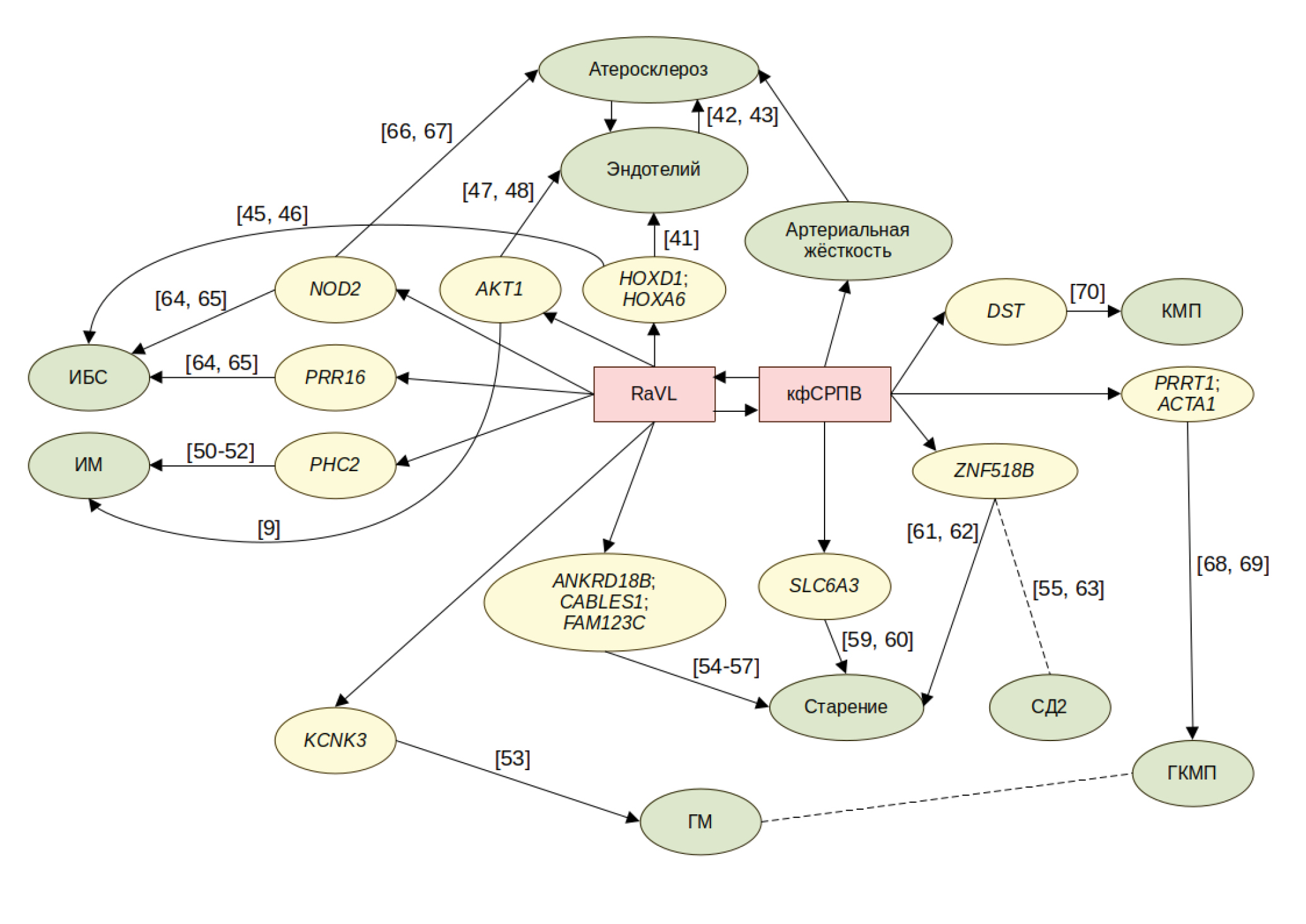 Во многих исследованиях эпигенетические модификации генома, в частности метилирование ДНК в CpG-сайтах, рассматривают как важный механизм, связывающий генетические варианты с риском развития ССЗ (см. обзор [40]). Нам удалось идентифицировать группу CpG-сайтов, связанную с генами, отвечающими за функционирование сердечно-сосудистой системы. По результатам проведенного нами поиска источников, где выявляли связь между параметрами RaVL и кфСРПВ и идентифицированными нами генами, ассоциированными с развитием конкретных заболеваний, мы составили схему, представленную на рис. 5.
