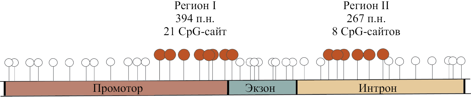 Рис. 1. Схема участков гена CSF1, выбранных для анализа метилирования. Регион I находится в промоторе и частично в первом экзоне гена CSF1, он содержит 21 анализируемый CpG-динуклеотид. Регион II расположен в первом интроне гена и содержит восемь анализируемых CpG-сайтов.
