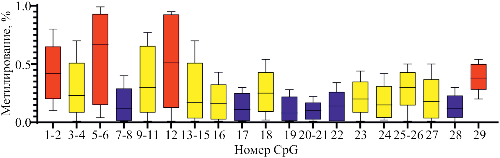 Всего проанализированы 29 CpG-сайтов (последовательно названных CpG1–29), некоторые CpG-динуклеотиды, расположенные в этих регионах, не были эпитипированы из-за ограничения технологии MassARRAY. Определены средние уровни метилирования CpG-сайтов в обоих регионах (рис. 2). Уровень метилирования составил 42% (26%; 50%).