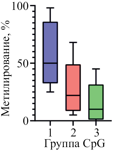 Уровень метилирования CpG-сайтов, расположенных в регионе I, составил 20% (8%; 40%), причем ближе к точке начала транскрипции уровень метилирования был ниже. В регионе II уровень метилирования CpG-сайтов составил 18% (8%; 40%). Внутри регионов все CpG-сайты были разделены на три группы, достоверно различающиеся (p <0.05) по уровню метилирования. Для CpG-динуклеотидов с высоким уровнем метилирования медиана составила 50% (40%; 74%), со средним уровнем – 22% (12%; 30%), с низким – 10% (2%; 18%) (рис. 3).