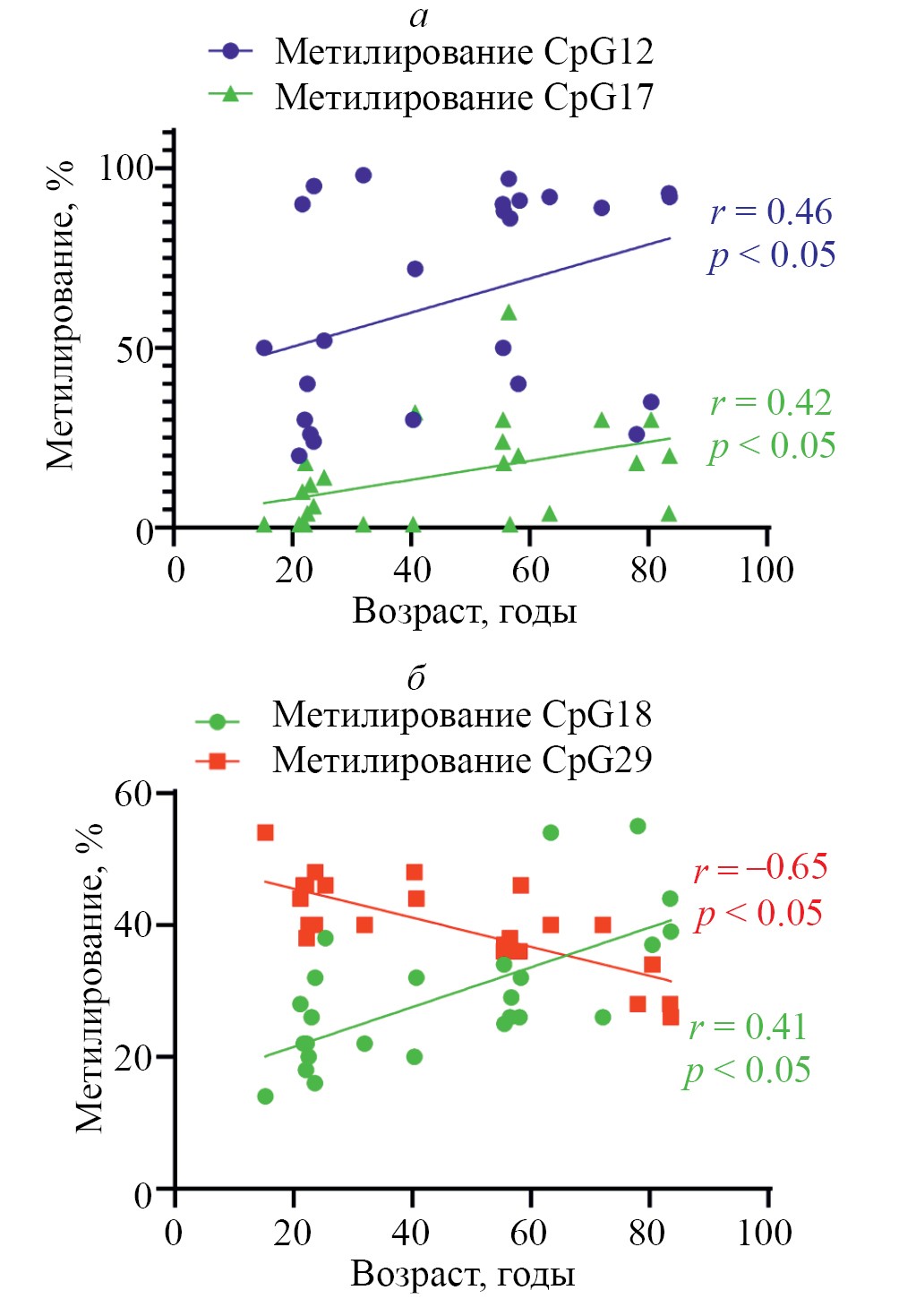 Установлено влияние возраста на метилирование CpG-сайтов региона II в группах CpG с высоким (r = 0.84, р <0.05) и низким (r = 0.92, p < 0.05) уровнями метилирования в группе 45–59 лет. Обнаружена положительная корреляции уровней метилирования CpG12 (r = 0.46, p < 0.05), CpG17 (r = 0.42, p < 0.05), CpG18 (r = 0.39, p < 0.05) и CpG29 (r = –0.65, p < 0.05) с возрастом доноров (рис. 4).
