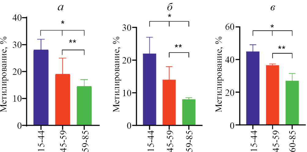 В группе 45–59 лет выявлена зависимость уровня метилирования сайтов CpG22 (r = 0.84, p < 0.05) и CpG29 (r = –0.53, p < 0.05) от возраста доноров. В группе 60–85 лет установлена корреляция между уровнем метилирования CpG29 (r = –0.84, p < 0.05) и возрастом.