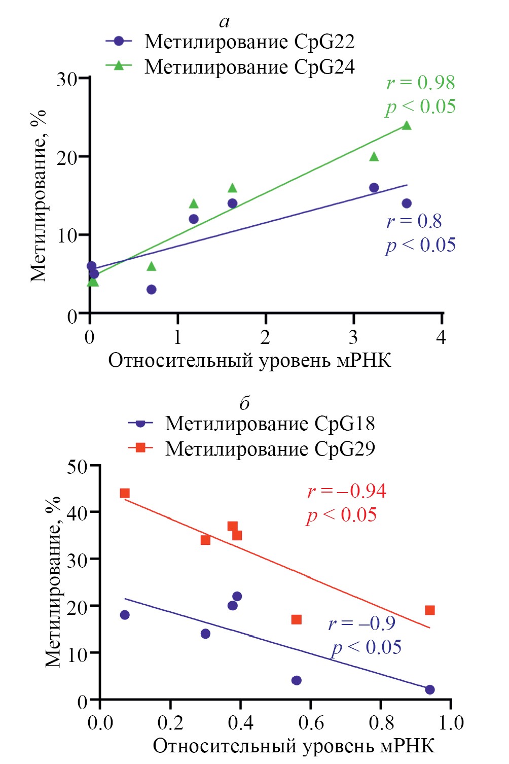 Рис. 6. Зависимость уровня метилирования CpG22 и CpG24 (а), CpG18 и CpG29 (б) от относительного уровня мРНК CSF1 у доноров.