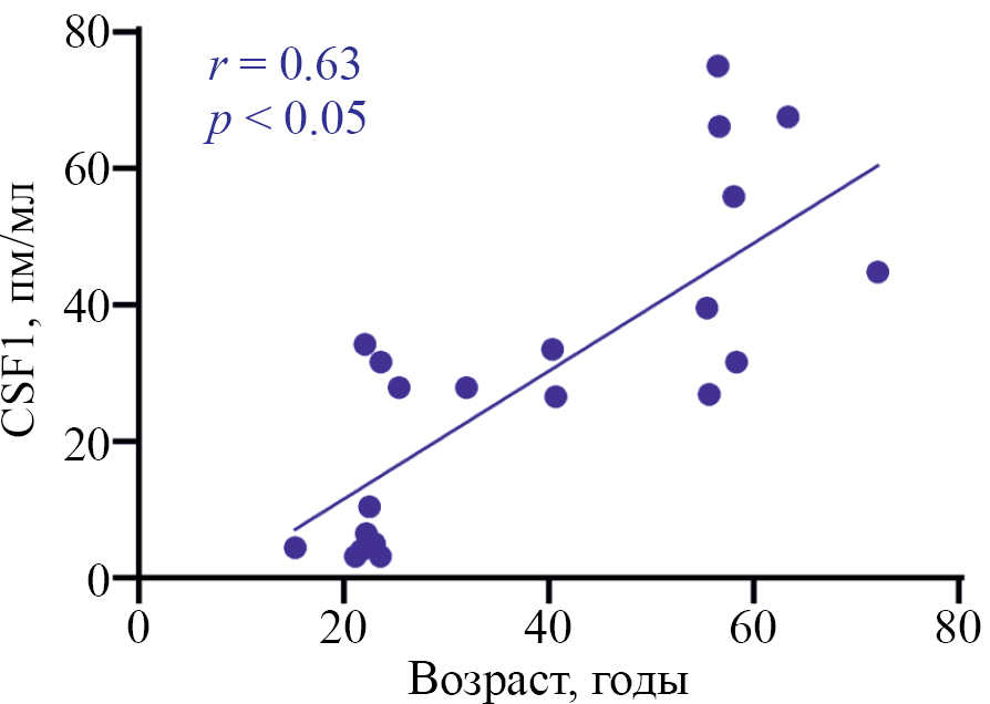 Проведенный на следующем этапе анализ выявил положительную зависимость между количеством M-CSF (CSF1) в плазме и возрастом доноров (r = 0.63, p < 0.05) (рис. 7).