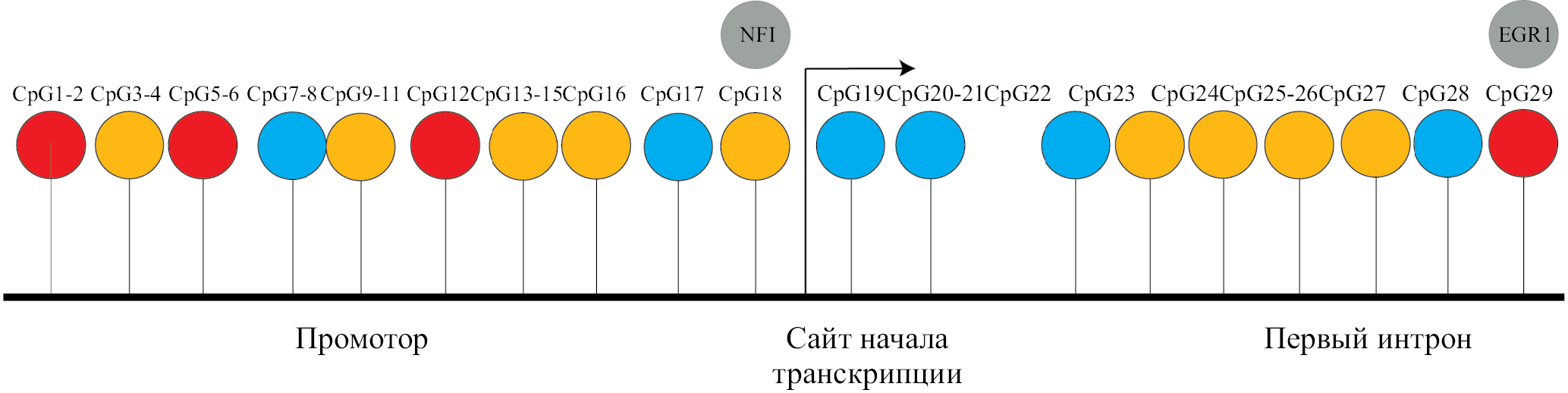 Рис. 8. Схема исследуемого региона CpG-островка гена CSF1. Красным цветом обозначены CpG с высоким уровнем метилирования, желтым – со средним, синим – с низким. Стрелка показывает направление транскрипции. Серыми кругами указаны транскрипционные факторы, в сайты посадки которых входят указанные CpG-динуклеотиды. CpG1–21 относятся к промотору, CpG22–29 – к интрону. Транскрипционные факторы семейства NFI и фактор EGR1 ассоциированы с регуляцией гена CSF1.