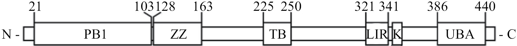 Рис. 1. Структурная организация белка p62. Доменная структура белка p62 человека (440 а.о.): 21–103 а.о. – домен PB1 (содержит мотивы Phox и Bem1p); 128‒163 а.о. – домен “цинкового пальца” ZZ-типа (ZZ); 225–250 а.о. – TRAF6-связывающий домен TB; 321–341 а.о. – LC3-взаимодействующий домен (LIR); 346–359 а.о. – взаимодействующий с KEAP1 домен KIR (K); 386–440 а.о. – убиквитинсвязывающий домен (UBA).