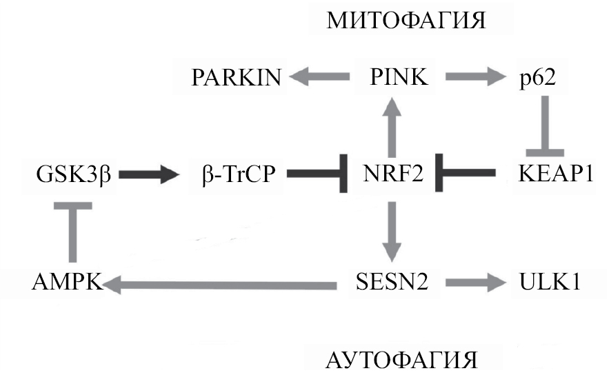 Аутофагия отвечает за деградацию внутриклеточных белков и поврежденных органелл в ответ на эндогенные и экзогенные стрессы, включая окислительный, гипоксический, эндоплазматического ретикулума, а также голодание, вызванное недостатком питательных веществ и факторов роста [105–107]. Окислительный стресс – это не только причина дисфункции митохондрий, но и следствие сбоя в работе системы контроля качества митохондрий. Дисбаланс возникает при дисрегуляции митохондриального биогенеза и митофагии [108]. В условиях подавления биогенеза и активации митофагии возникает дефицит энергии. И наоборот, при подавлении митофагии и активации митохондриального биогенеза в клетке накапливается большое количество поврежденных митохондрий, которые продуцируют высокие уровни АФК и при этом не удовлетворяют энергетические потребности из-за нефункциональной дыхательной цепи [109]. В этом случае клетку может “выручить” белок NRF2, который, образуя регуляторные петли, участвует в митохондриальном биогенезе. Так, NRF2 усиливает экспрессию PGC-1α (peroxisome proliferator-activated receptor-gamma coactivator) – главного регулятора митохондриального биогенеза – и NRF1 (nuclear respiratory factor 1), которые регулируют транскрипцию митохондриальной ДНК. PGC-1α, в свою очередь, дезактивирует GSK3β через p38 [110], что блокирует один из путей инактивация NRF2 (рис. 2). Блокирование второго пути инактивации NRF2 включает взаимодействие с p62, который взаимодействует с ингибитором NRF2 – KEAP1. Однако регуляция митофагии белком NRF2 этим не ограничивается. Этот ТФ регулирует экспрессию белка PINK1, который играет ключевую роль в индукции митофагии. Для жизнеспобности клетки важно, чтобы активация NRF2 приводила не к дисбалансу в направлении митофагии или митохондриального биогенеза, а “работала” на поддержания динамического баланса, обеспечивающего стабильность митохондрий [111, 112].