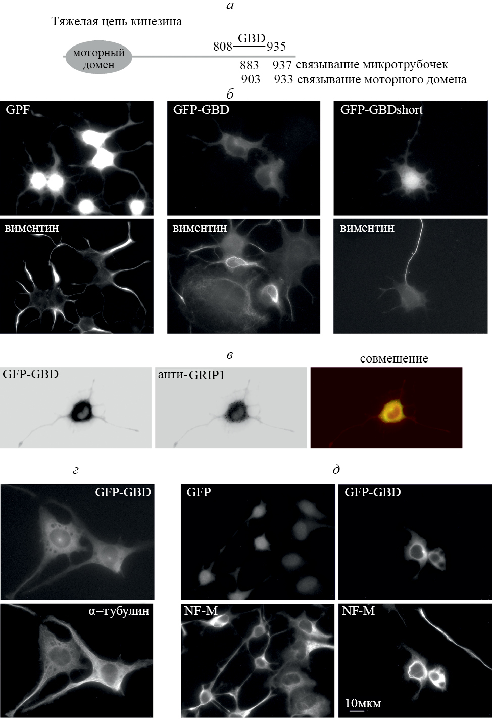 Рис. 3. Доминантно-негативное ингибирование взаимодействия GRIP1 с кинезином влияет на вход промежуточных филаментов (ВФ) в нейриты клеток CAD. а – Схема положения GBD (GRIP1 Binding Domain) на тяжелой цепи кинезина. б – Эффект присутствия GBD на распределение ВФ в клетках CAD. Клетки в полной среде трансфицированы плазмидой, кодирующей GFP-GBD, GFP (в качестве контроля) или GFP-GBD-short и через 20–24 ч перенесены в бессывороточную среду для индукции формирования отростков в течение последующих 48 ч. Затем клетки фиксировали и подвергали иммунофлуоресцентному окрашиванию: антителами 3c8 к виментину мыши (б), антителами к GRIP1 (в, изображения инвертированы для наглядности), антителами к α-тубулину DM1α (г) и антителами N2912 к белку NF-M нейрофиламентов (д). Масштабная линейка 10 мкм на всех изображениях.