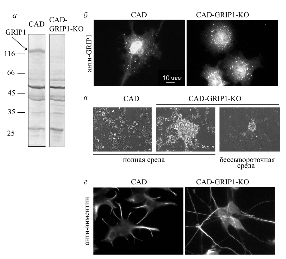 Рис. 4. Нокаут гена белка GRIP1 меняет адгезивные свойства клеток CAD, но не препятствует заполнению отростков виментином. a – Иммуноблотинг с анти-GRIP1-антителами гомогенатов клеток CAD – контрольных и с нокаутом гена белка GRIP1. б – Сравнение иммунофлуоресцентного окрашивания клеток CAD – контрольных и с нокаутом гена белка GRIP1, анти-GRIP1-антителами. в – Фазово-контрастное изображение клеток CAD – контрольных и с нокаутом гена белка GRIP1, в полной и бессывороточной среде. г – Иммунофлуоресцентное окрашивание антителами к виментину клеток CAD (контрольных и с нокаутом гена белка GRIP1), инкубированных в бессывороточной среде. Части б и г – масштаб 10 мкм.