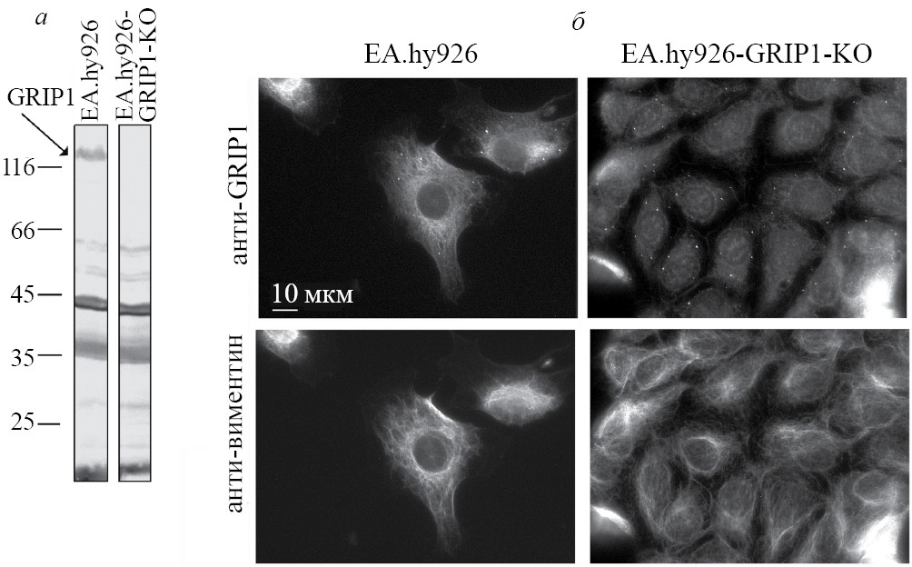 Иммуноблотинг с анти-GRIP1-антителами показал, что из эндотелиальных клеток с нокаутом гена белка GRIP1 исчез также компонент с молекулярной массой 130 кДа, то есть полноразмерный GRIP1 (рис. 5а), при этом в клетках с нокаутом не наблюдалось декорирования виментиновых филаментов (рис. 5б).
