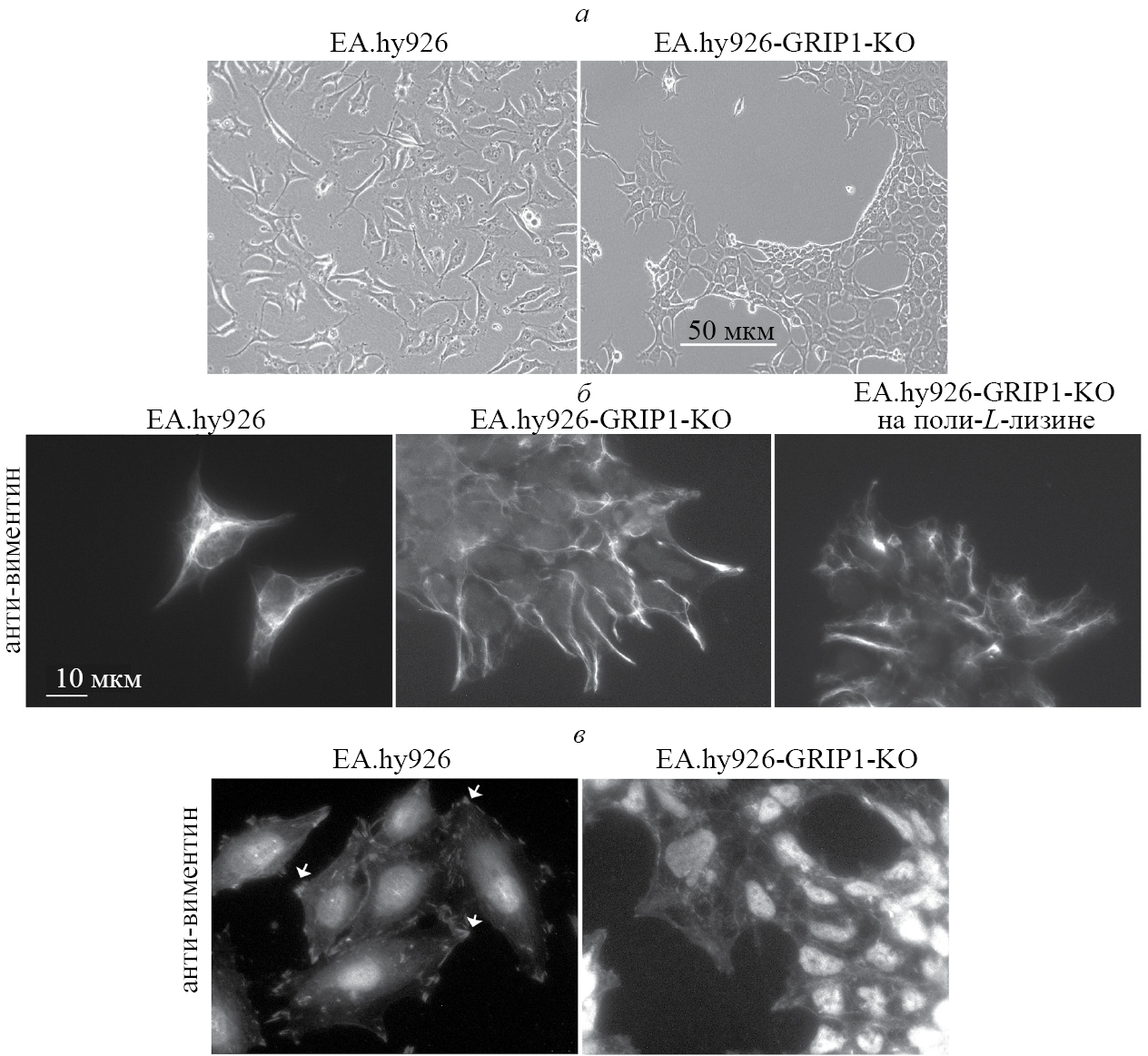 Рис. 6. В истощенных по белку GRIP1 эндотелиальных клетках EA.hy926 отсутствуют ФК и меняется расположение ВФ. а – Фазово-контрастное изображение клеток EA.hy926 – контрольных и с нокаутом гена белка GRIP1. б – Распределение виментина (антитела V9) в клетках EA.hy926 – контрольных и с нокаутом гена белка GRIP1, на простом стекле и стекле, покрытом поли-L-лизином. в – Иммунофлуоресцентное окрашивание клеток EA.hy926 (контрольных и с нокаутом гена белка GRIP1) антителами к винкулину, маркеру ФК. Стрелками указаны ФК. Части б и в масштаб 10 мкм, а – 50 мкм.