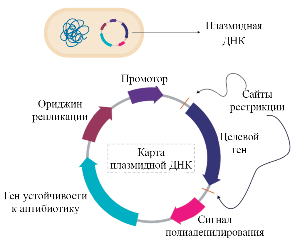 Чаще всего в качестве ДНК-вакцин используют плазмиды, которые представляют собой кольцевую двухцепочечную ДНК, содержащую последовательности, необходимые для ее репликации и экспрессии целевого гена как в бактериальных клетках, так и in vivo в клетках млекопитающих. Классическая ДНК-вакцина содержит следующие структурные элементы: целевой ген под контролем эукариотического промотора, точку начала репликации (ориджин репликации, ori), сигнал полиаденилирования, а также сайты узнавания эндонуклеазами рестрикции для генно-инженерных манипуляций и ген устойчивости к антибиотику в качестве селективного маркера (рис. 1).