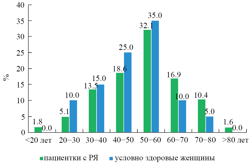 Средний возраст пациенток с РЯ составил 52.8 года (медиана 53 года), средний возраст женщин контрольной группы — 48.6 лет (медиана 50 лет). Средние показатели (и медиана) возраста женщин в обеих группах не имели статистически значимых различий. Распределение пациенток и женщин контрольной группы по возрасту представлено на рис. 2.