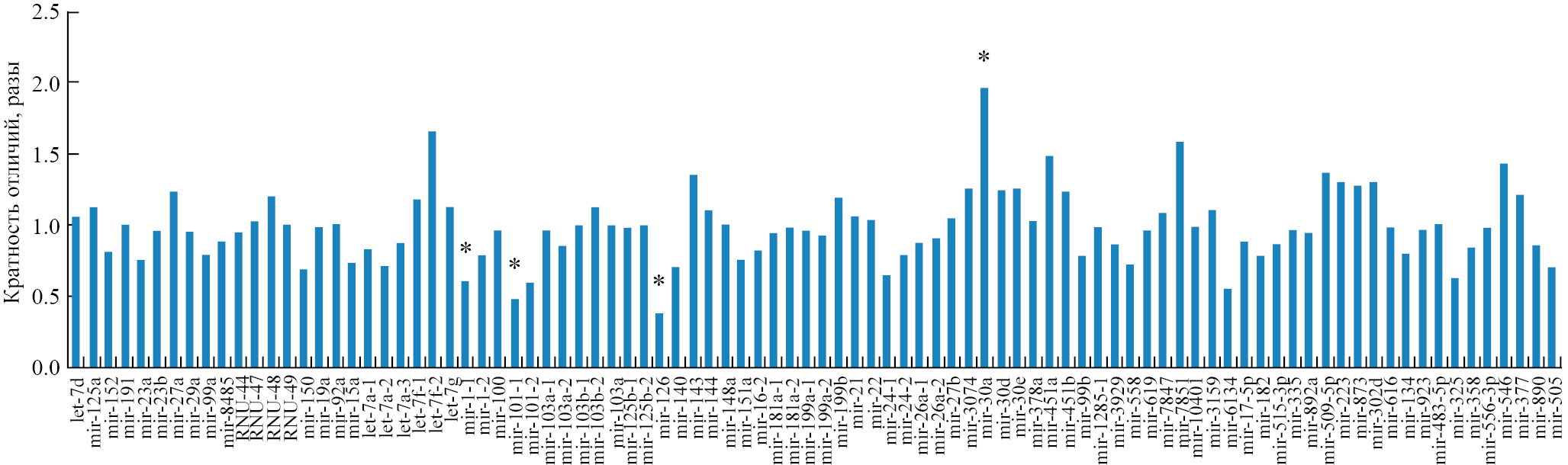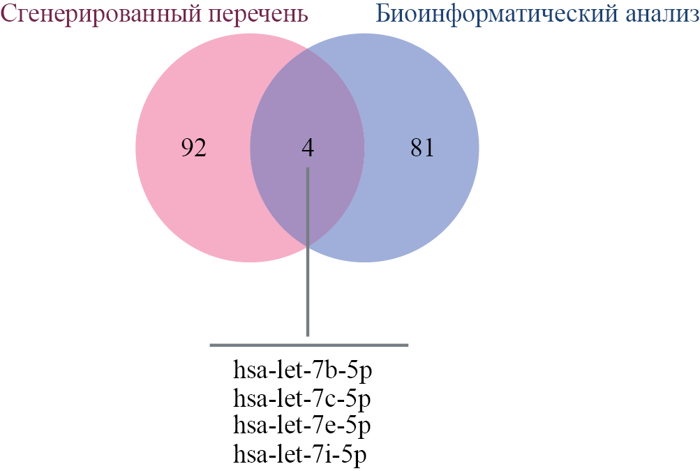 Адекватность примененного биоинформатического подхода проверяли с помощью дополнительного набора микроРНК, который также использовали при валидации методом ПЦР-РВ. Для генерации использовали базу mirBase (https://www.mirbase.org/). В состав сгенерированного набора также вошли микроРНК домашнего хозяйства, отобранные по среднему уровню экспрессии в нормальных тканях человека.