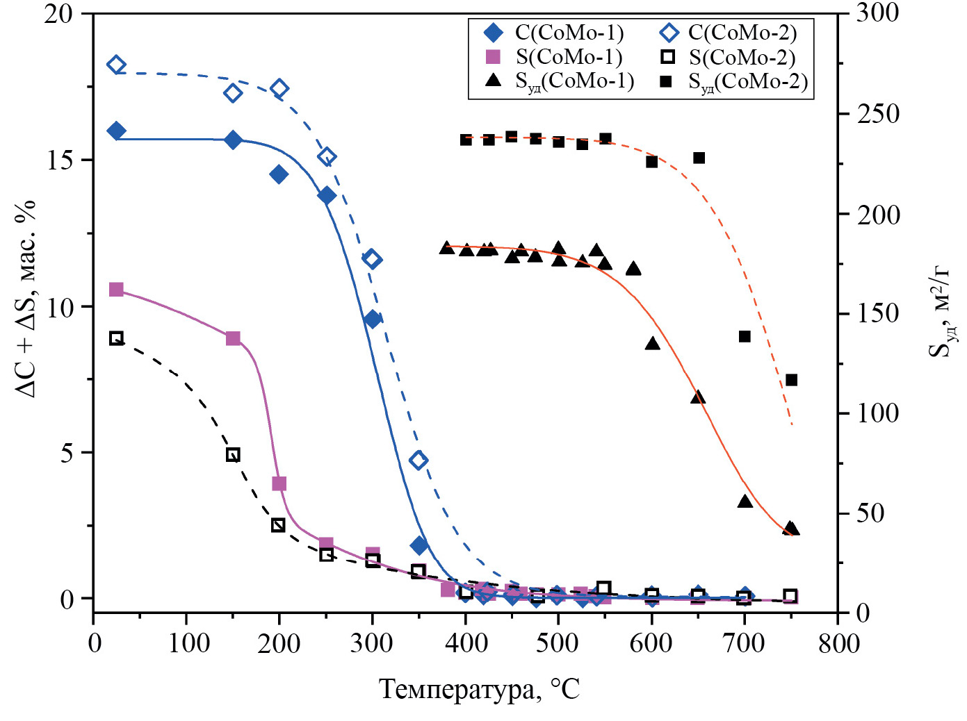 Наиболее активно используется направление по окислению коксовых отложений за счет использования кислородсодержащих смесей и воздуха для проведения регенерации. Многие авторы выполняли различные исследования в этом направлении. Одно из них представлено на рис. 2. По имеющимся зависимостям можно увидеть, что при увеличении температуры происходит снижение не только содержания углерода, наблюдаемое равномерно с увеличением температуры, но и серы, начинающееся с температуры около 200–250°С. Эти изменения свидетельствуют об удалении коксовых отложений и окислении сульфидной фазы и индивидуальных сульфидов Co, Ni и Mo. Наиболее активное удаление углерода заканчивается на температуре в 450°С, но полное удаление углеродных следов происходит при более высоких температурах, которые могут привести к необратимому фазовому изменению носителя.