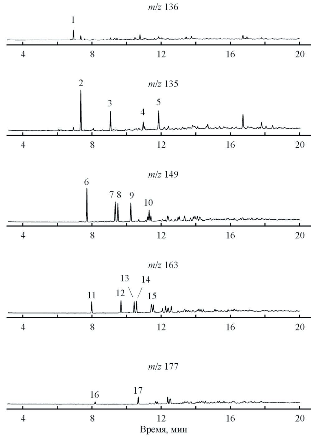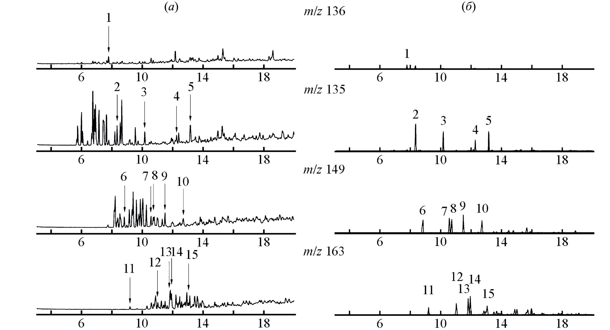 В настоящее время для анализа УВ ряда адамантана С10–С14 в нефтях применяют метод хромато-масс-спектрометрии с использованием характеристических ионов m/z 135, 136, 149, 163 и 177. Типичная масс-хроматограмма адамантанов С10-С14 представлена на рис. 1. Индексы удерживания и температуры кипения адамантанов С10–С14 представлены в табл. 1 (см. ниже). Однако на масс-хроматограммах с характеристическими ионами m/z 135, 149 и 163 наряду с адамантанами С11, С12 и С13, кроме протоадамантанов, перед моно-, ди- и триметиладамантанами элюируются и ароматические УВ С10, С11 и С12 соответственно (рис. 1) Очевидно, что ионы с m/z 135, 149 и 163 являются изотопными ионами молекулярных ионов 134, 148 и 162 моноароматических УВ С10, С11 и С12 соответственно [13]. Известно, что интенсивность изотопных ионов для УВ значительно меньше, чем молекулярных ионов; а для ароматических УВ интенсивность молекулярных ионов значительно выше, чем для насыщенных УВ. Однако относительное содержание ароматических УВ настолько велико по сравнению с относительным содержанием адамантанов и протоадамантанов, что даже небольшая интенсивность изотопных ионов для них является сопоставимой величиной интенсивности характеристических ионов для адамантанов.