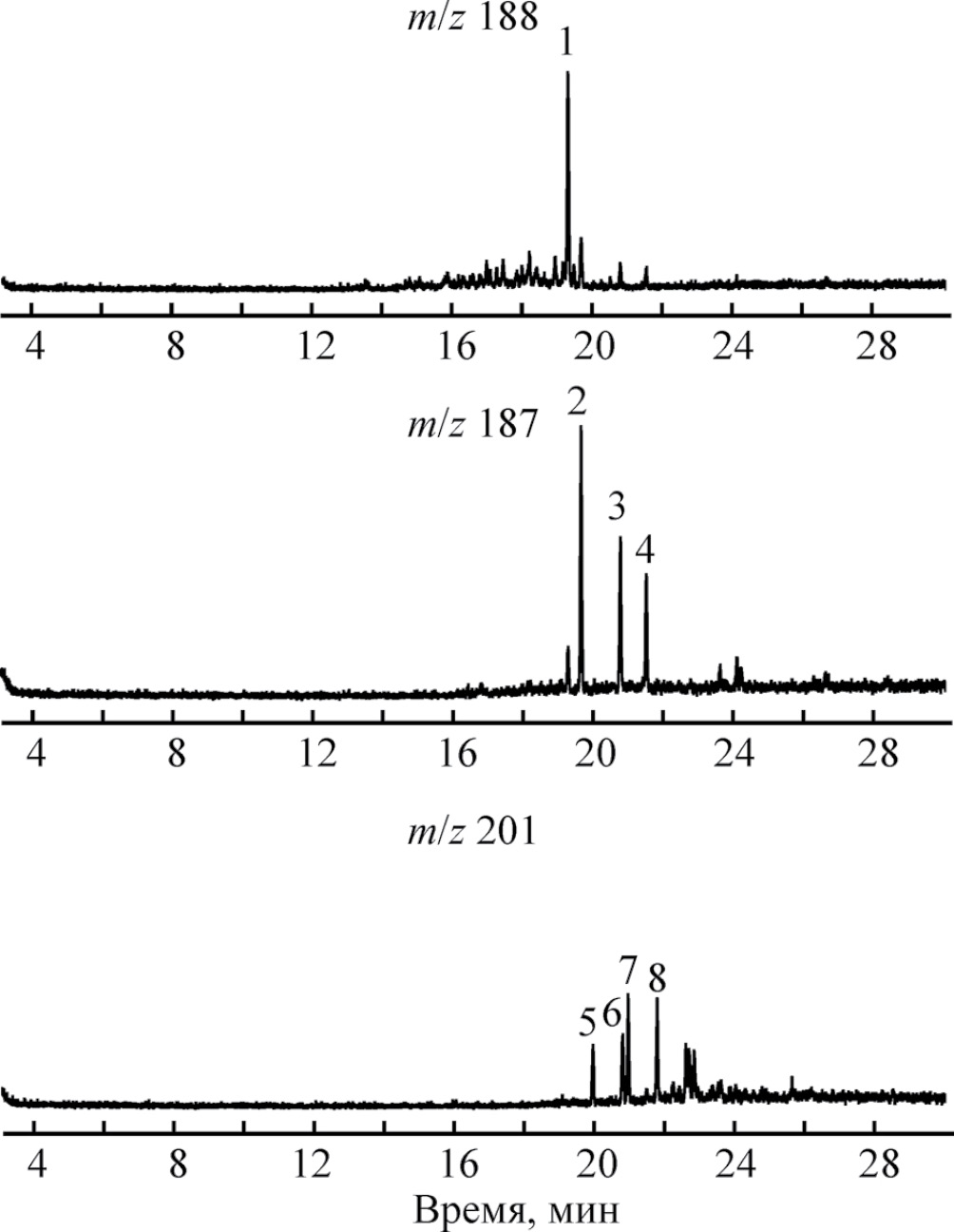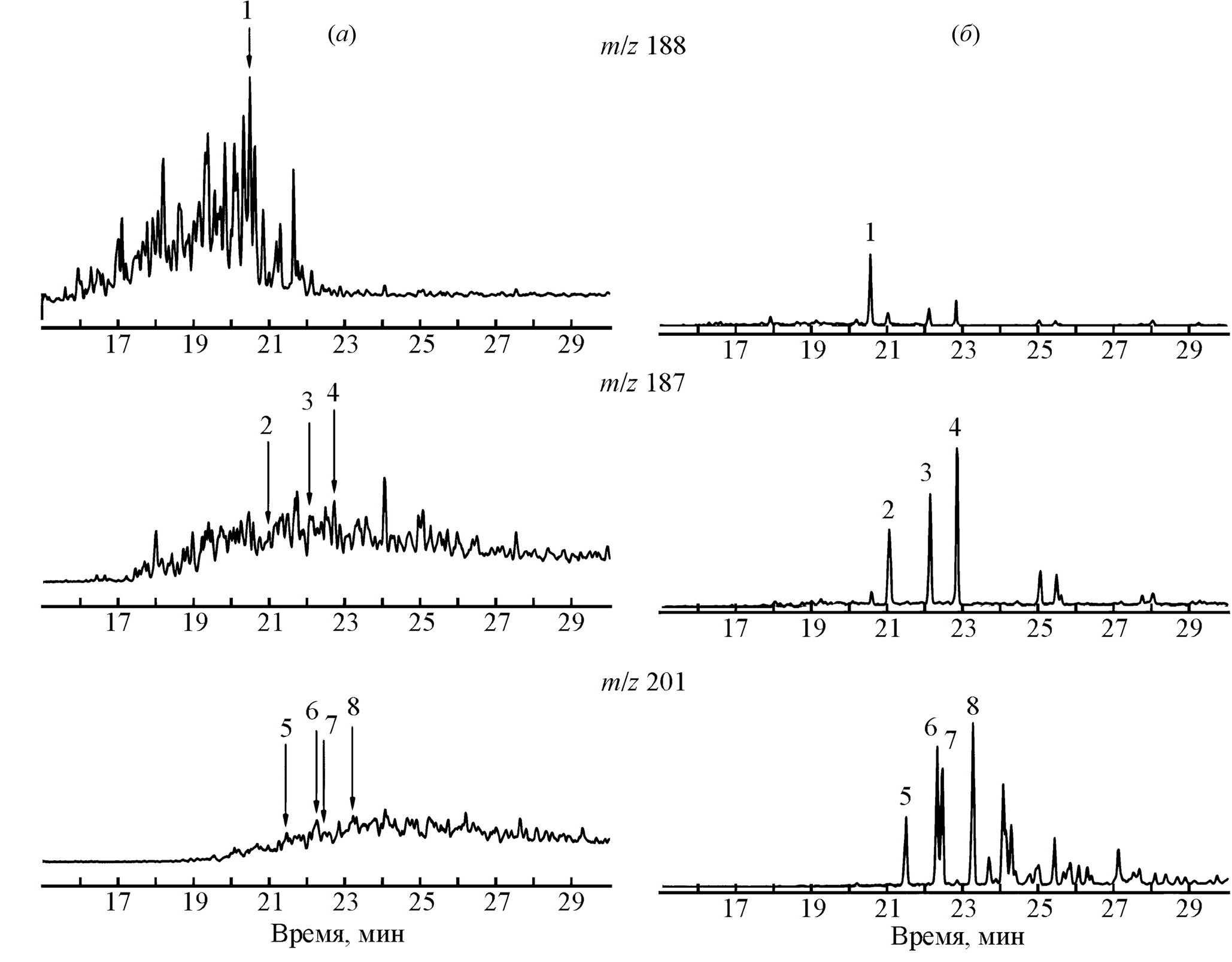 По аналогии с адамантанами, на масс-хроматограммах по характеристичным для диамантанов ионам m/z 187, 188, 201 нефтей, преимущественно морского генезиса, также присутствуют пики недиамантановых углеводородов. Типичная масс-хроматограмма диамантанов С14–С16 представлена на рис. 3. Как и в случае с протоадамантанами, эти пики принадлежат протодиамантановым УВ и в результате изомеризации с бромистым алюминием и алюмосиликатом изомеризуются в УВ ряда диамантана. Это подтверждает сравнение хроматограмм по характеристичным ионам диамантанов С14–С16, полученных до и после изомеризации над бромистым алюминием. Нетрудно заметить, что присутствующие на масс-хроматограммах наряду с диамантанами С14–С16 дополнительные пики с теми же характеристическими ионами (рис. 4а) исчезают после каталитических превращений с бромистым алюминием (рис. 4б).