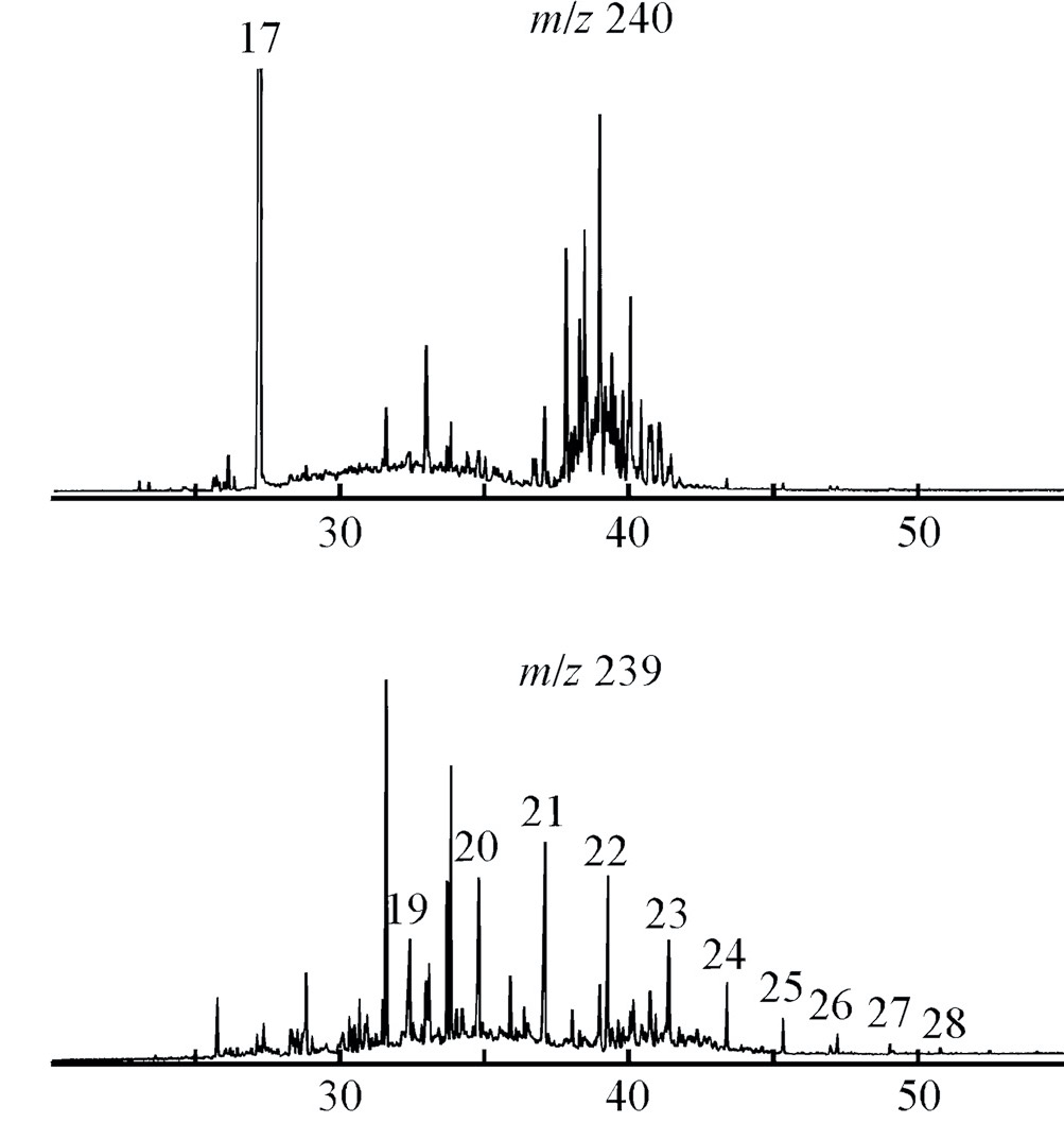 Рис. 5. Типичная масс-хроматограмма по ионам m/z 240 и 239 на примере нефти месторождения Курганное, скв. 366, 2052– 2054 м, возраст K1. Цифрами отмечено количество атомов углерода в н-алкане.