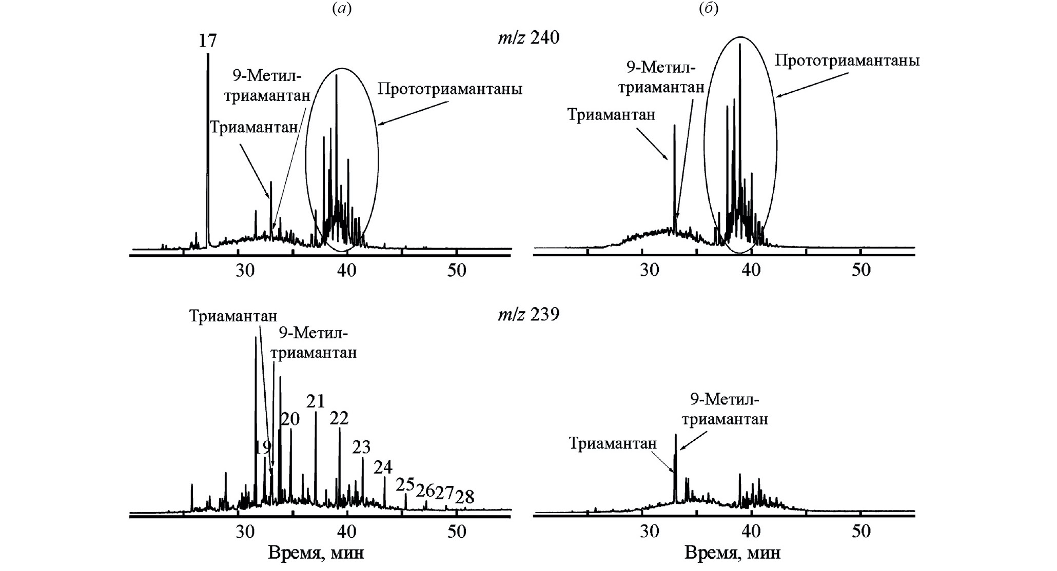 В то же время на масс-хроматограммах с характеристическими ионами триамантанов (m/z 240 и 239) у всех нефтей разного генотипа, кроме прототриамантанов, присутствует гомологический ряд н-алканов, начиная с н-С17Н38. Интересно отметить, что молекулярная масса триамантана 240 совпадает с молекулярной массой н-С17Н38, а любой н-алкан с числом углерода в молекуле 19 и более имеет осколочный ион с m/z 239, являющийся характеристическим для моноалкилзамещенных триамантанов.