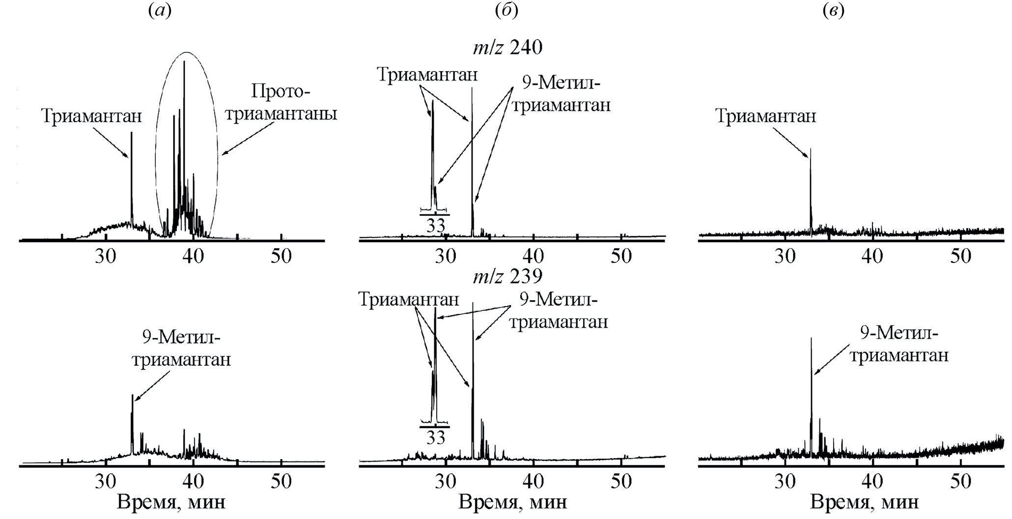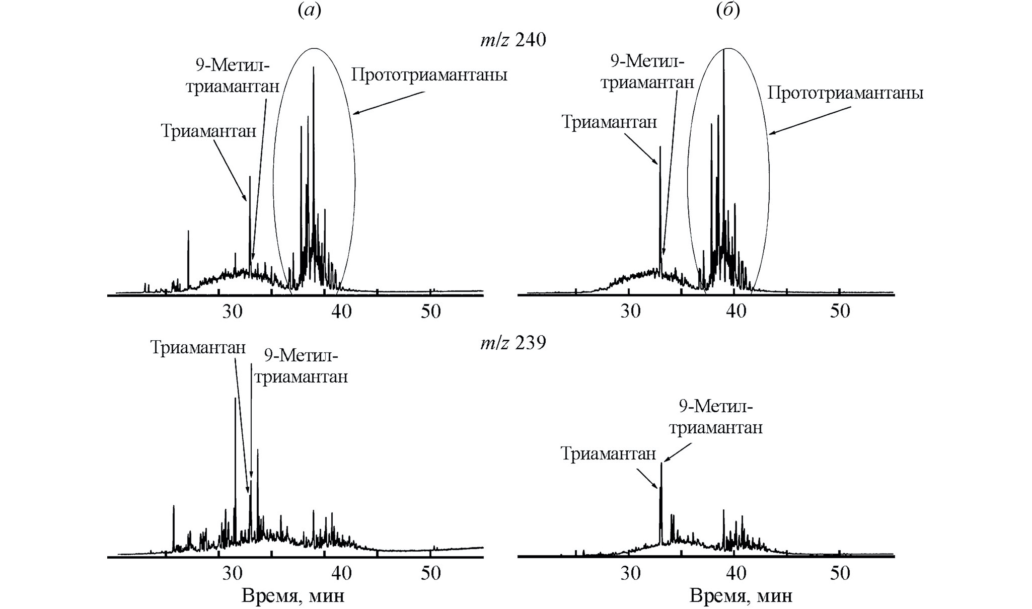 Анализ УВ осуществляли методом хромато-масс-спектрометрии (ГХ-МС) на приборе Agilent 6890N/5975С (США) со следующими условиями: колонка HP-1MS 25 м × 0.25 мм × 0.5 мкм, начальная температура анализа 70°С, программирование температуры со скоростью подъема температуры 4°С/мин до 290°С. Газ-носитель – гелий. Режим работы масс-спектрометрического детектора: диапазон сканирования m/z 50–550, ионизация электронами (энергия ионизации 70 эВ), ускоряющее напряжение 3500 В, температура источника ионов 250°С. Идентификацию соединений проводили, используя соответствующие характеристические ионы (m/z 135, 136, 149, 163 и 177 для адамантанов с числом атомов С 10–14, m/z 187–201 для диамантанов с числом атомов С 4–16 , m/z 239 и 240 для триамантанов с числом атомов С 18, 19 и m/z 291 и 292 для тетрамантанов с числом атомов С 22, 23).