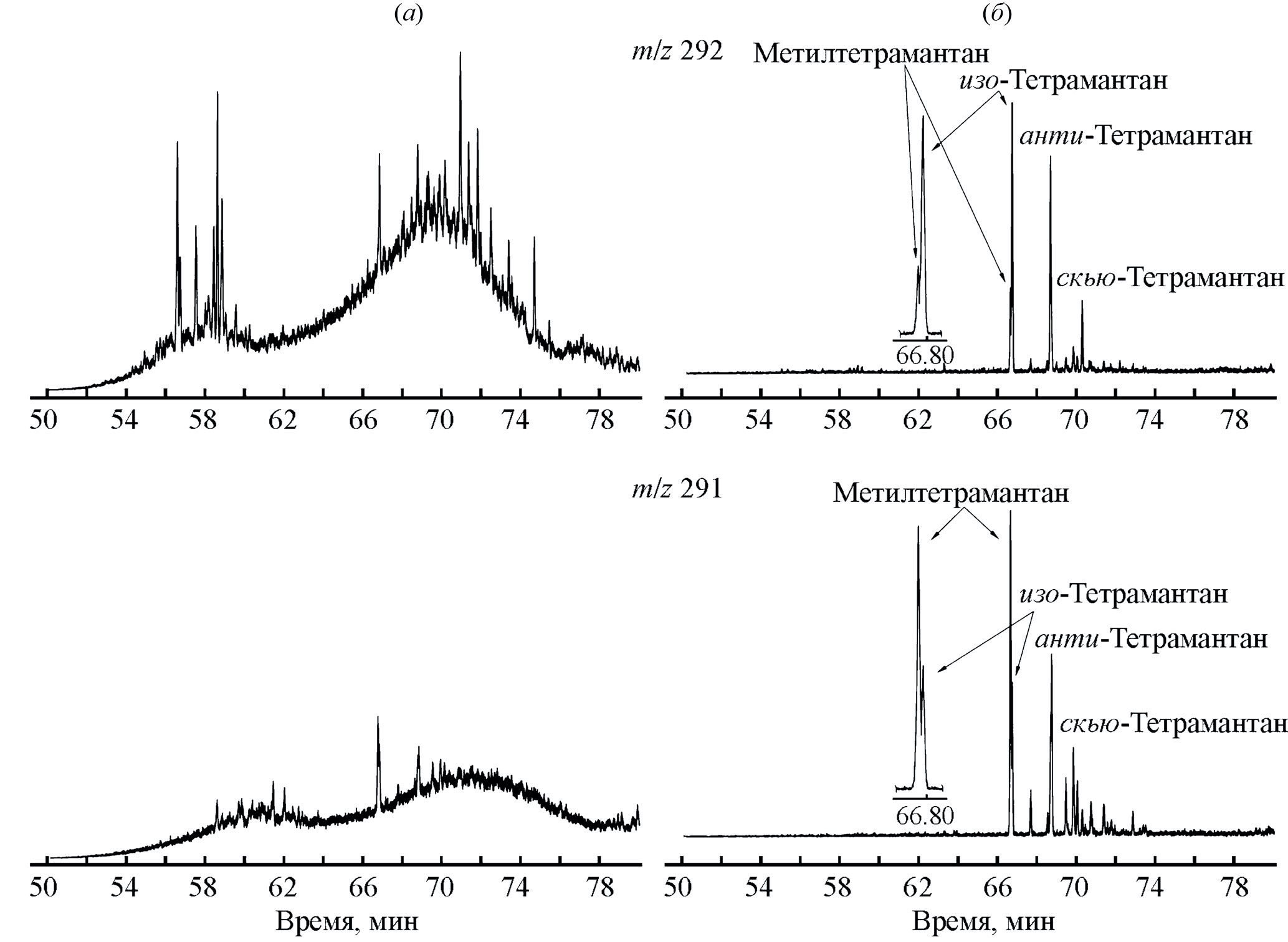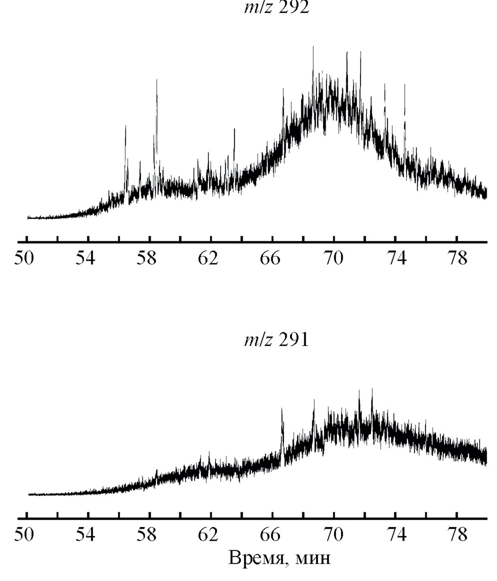 Как показали наши исследования, в отличие от триамантанов, по масс-хроматограммам которых среди множества пиков с характеристическими ионами m/z 239 и 240 возможно определить триамантан и 9-метилтриамантан [21], по масс-хроматограммам с характеристическими ионами тетрамантанов m/z 291 и 292 идентифицировать тетрамантаны невозможно, поскольку на этих масс-хроматограммах наблюдается большой нафтеновый «горб», содержащий огромное количество неразделенных полициклических углеводородов (рис. 9) [25].