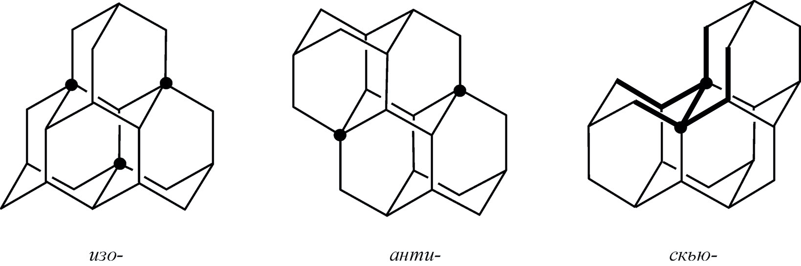 Известно, что, чем больше четвертичных атомов углерода в молекуле углеводорода при прочих равных условиях, тем ниже его температура кипения. Нетрудно заметить, что изо-тетрамантан имеет 3 четвертичных атома, тогда как в анти- и скью-тетрамантанах их по 2 (рис. 11), т.е. меньшую температуру кипения должен иметь изо-тетрамантан.