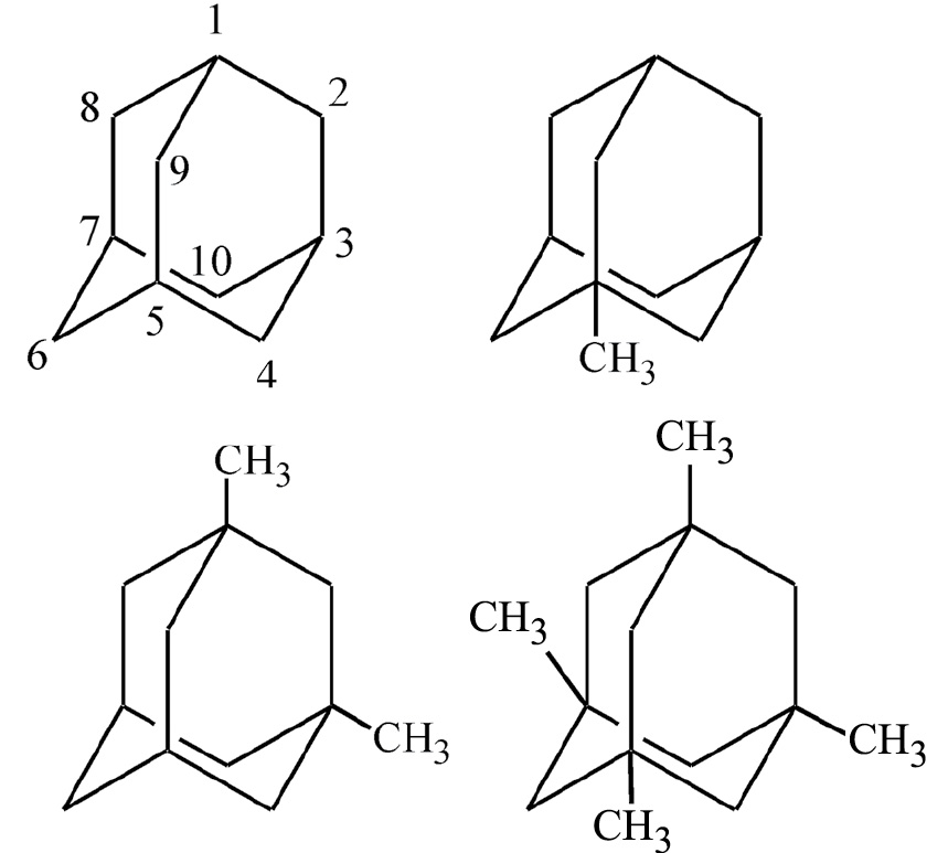 Адамантан 1-Метиладамантан 1,3-Диметиладамантан 1,3,5-Триметиладамантан 1,3,5,7-Тетраметиладамантан 2-Метиладамантан 1,4-Диметиладамантан, цис 1,4-Диметиладамантан, транс 1,3,6-Триметиладамантан 1,2-Диметиладамантан 1,3,4-Триметиладамантан, цис 1,3,4-Триметиладамантан, транс 1,2,5,7-Тетраметиладамантан 1-Этиладамантан 1-Этил-3-метиладамантан 1-Этил-3,5-диметиладамантан 2-Этиладамантан | 10 11 12 13 14 12 12 12 13 12 13 13 14 12 13 14 12 | 190 194 197 199 201 207 210 211 212 216 217 218 219 221 223 225 227 | 1072 1093 1109 1121 1130 1152 1165 1170 1180 1195 1205 1210 1216 1220 1233 1238 1248 |