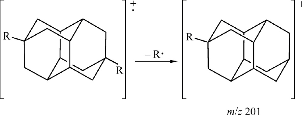 Распад молекулярного иона ди-, и, очевидно, полиалкилзамещенных диамантанов вначале, аналогично адамантанам, происходит путем элиминирования одной алкильной группы. Т.е. в масс-спектрах диметилдиамантанов максимальным по интенсивности пиком (характеристическим) в масс-спектре будет ион с m/z = 201, а у полиалкилзамещенных – m/z 187 + n14, где n соответствует числу алкильных групп.