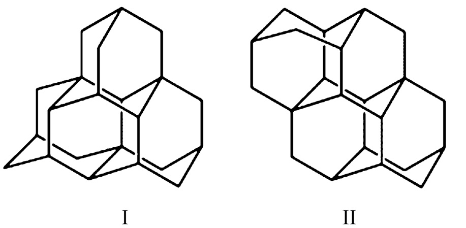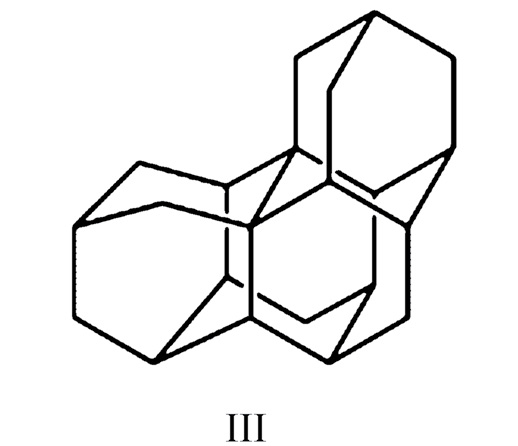 В отличие от адамантана, диамантана и триамантана, незамещенный тетрамантан имеет 3 структурных изомера – изо- (I), анти- (II) и скью-тетрамантаны (III):