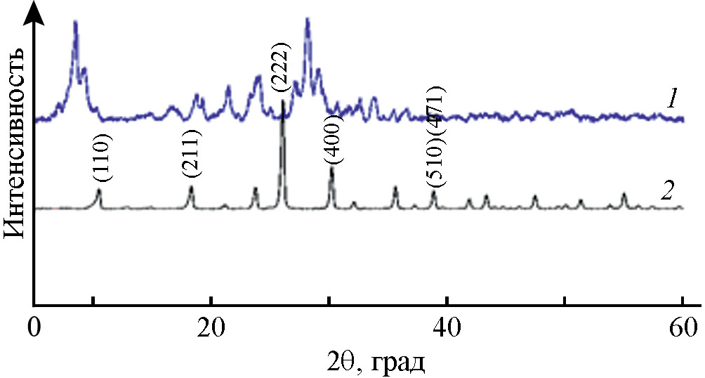 Рис. 2. Дифрактограммы Се- (1) и La- (2)-ПОВ-содержащих каталитических систем. Элементный состав катализатора, мас. %: C – 24.58; Ce – 3.55; P – 1.57; W – 56.0; О – 18.3; в атомн. %: C – 53.0; Ce – 0.77; P – 1.56; W – 9.4; О – 35.3.