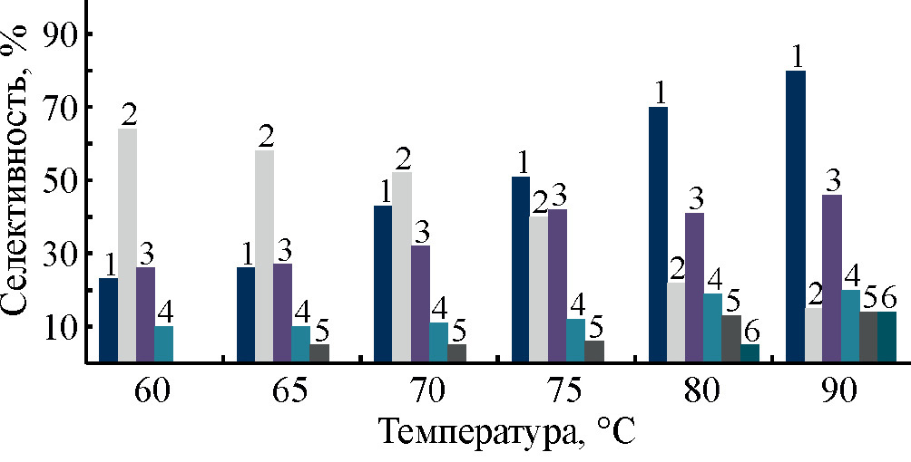 Рис. 3. Зависимость конверсии 4-метилстирола и селективности по продуктам окисления (в %) от температуры реакции (мольное соотношение 4-метилстирол : Н2О2 = 1 : 2, τ = 7 ч). 1 – конверсия 4-метилстирола; 2 – селективность по метилфенилоксирану, 3 – селективность по 4-метилбензальдегиду; 4 – селективность по 4-метилфенилацетальдегиду; 5 – селективность по метилфенилэтандиолу; 6 – селективность по 4-ме- тилбензойной кислоте.