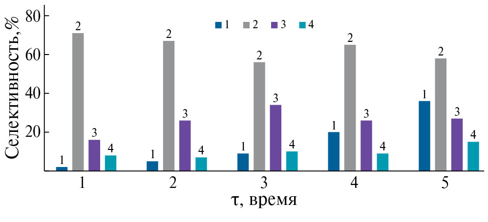 Рис. 4. Зависимость конверсии ДЦПД и селективности по продуктам окисления от продолжительности реакции (Т = 50°С, pH 3.8, мольное соотношение ДЦПД : H2O2 = 1 : 2). 1 – конверсия ДЦПД, 2 – селективность по эпоксидам, 3 – селективность по спиртам, 4 – селективность по продуктам окислительной олигомеризации ДЦПД.
