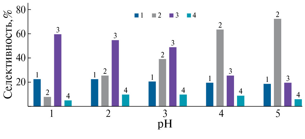 Рис. 5. Зависимость конверсии ДЦПД и селективности по продуктам окисления от величины рH среды (Т = 50°С, τ = 4 ч). 1 – конверсия ДЦПД, 2 – селективность по эпоксидам, 3 – селективность по спиртам, 4 – селективность по продуктам окислительной олигомеризации ДЦПД.