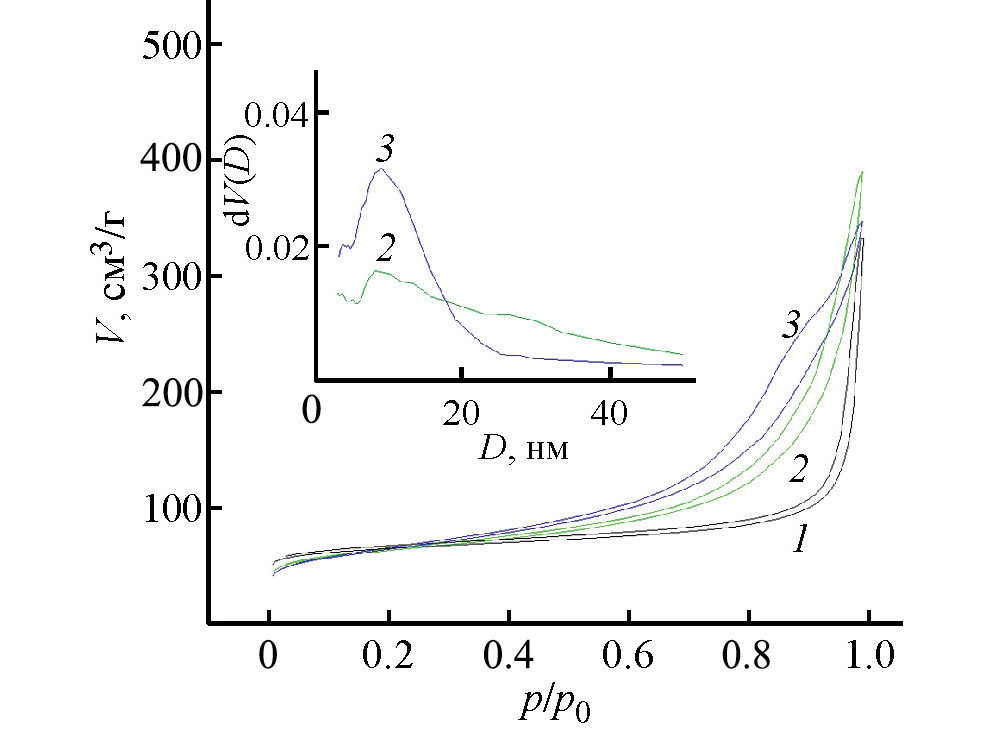 Рис. 1. Изотермы адсорбции и распределение пор по размерам (вставка) цеолита HZSM‑23 (1) и HZSM-23/Al2O3 носителей: Z60A40 (2), Z40A60 (3).