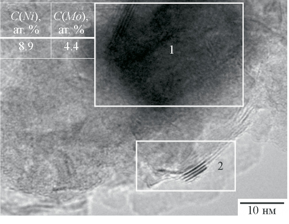 Снижение концентрации никеля и молибдена, взятых в мольном соотношении 0.5 по отношению к друг другу, не приводит к заметным изменениям в морфологии сульфидных частиц, однако сопровождается снижением Nчаст/S. Образцы ПМ-12-0.4, ПМ-12 и ПМ-12-1, имеющие одно и то же содержание молибдена, но разные концентрации никеля, характеризуются близкими средними показателями L и Nчаст/S. Однако для образца ПМ-12-1 на снимках ПЭМ было отмечено появление областей, обогащенных никелем (рис. 2, область 1) и не содержащих частиц с морфологией, типичной для MoS2 (рис. 2, область 2). Как видно из табл. 2, сульфидная фаза в катализаторе МО-12, приготовленном из оксида молибдена, характеризуется меньшей средней длиной и числом слоев (Nслоев) по сравнению с той, которая формируется в образце ПМ-12, полученном из парамолибдата аммония.