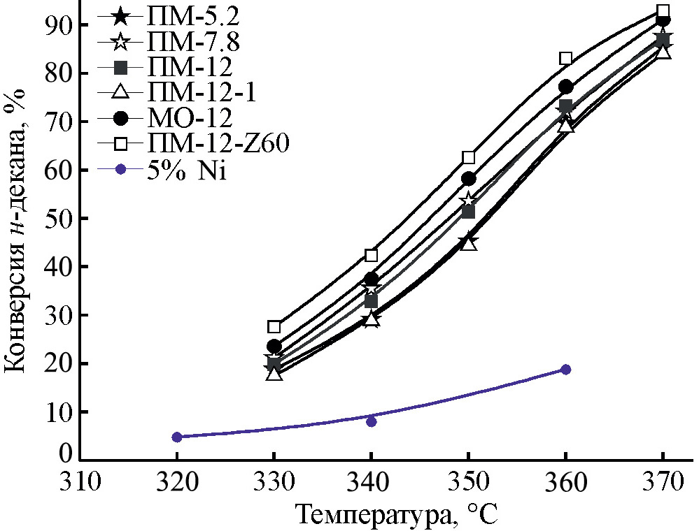 Тестирование каталитических свойств образцов проводили в проточном трубчатом реакторе при следующих условиях: P = 3.5 МПа, T = 320–370°C, массовая скорость подачи сырья = 2.35 ч−1, отношение H2 /сырье = 450 нм3/м3. Непосредственно перед испытанием катализаторы подвергали жидкофазному сульфидированию in situ по методике, описанной в [18]. Модельное сырье для испытаний представляло собой н-декан с добавлением диметилдисульфида (ДМДС), обеспечивающего постоянство химического состава катализаторов, и анилина, стабилизирующего каталитические показатели в условиях испытаний. ДМДС и анилин добавляли в количестве, эквивалентном содержанию серы и азота 500 и 15 ppm соответственно. Расчет конверсии н-декана, селективности в направлении изомеризации и выхода продуктов изо-C10 осуществляли на основании результатов хроматографического анализа газовых и жидких проб на газовом хроматографе Хроматэк-Кристалл 5000. Продолжительность каждого испытания составляла не менее пяти суток. Для проверки стабильности каталитических показателей с течением времени в некоторых испытаниях в конце цикла возвращались к начальным условиям. Показатели в начале и в конце цикла показывали хорошую сходимость при превращении модельного сырья, содержащего ДМДС и анилин.