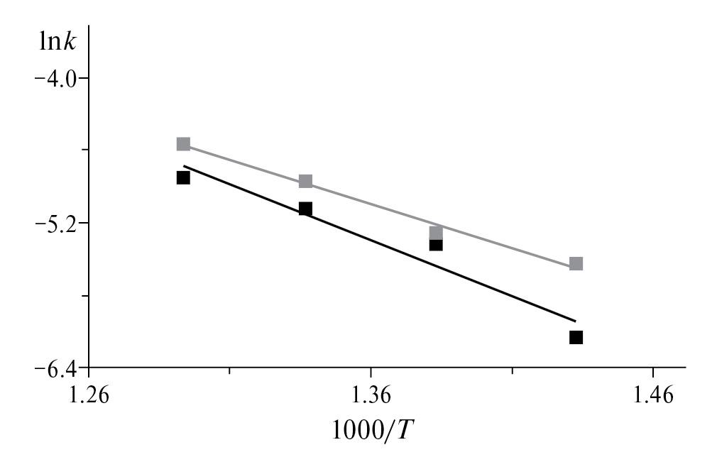 По результатам анализа температурных зависимостей константы скорости н-гексадекана и н-гексадекана в смеси с изопропанолом установлено, что более низкое значение наблюдаемой энергии активации крекинга н-гексадекана отмечается для н-гексадекана в смеси. Эти данные указывают на эффект промотирования реакции крекинга н-гексадекана при его совместном превращении с алифатическим спиртом.