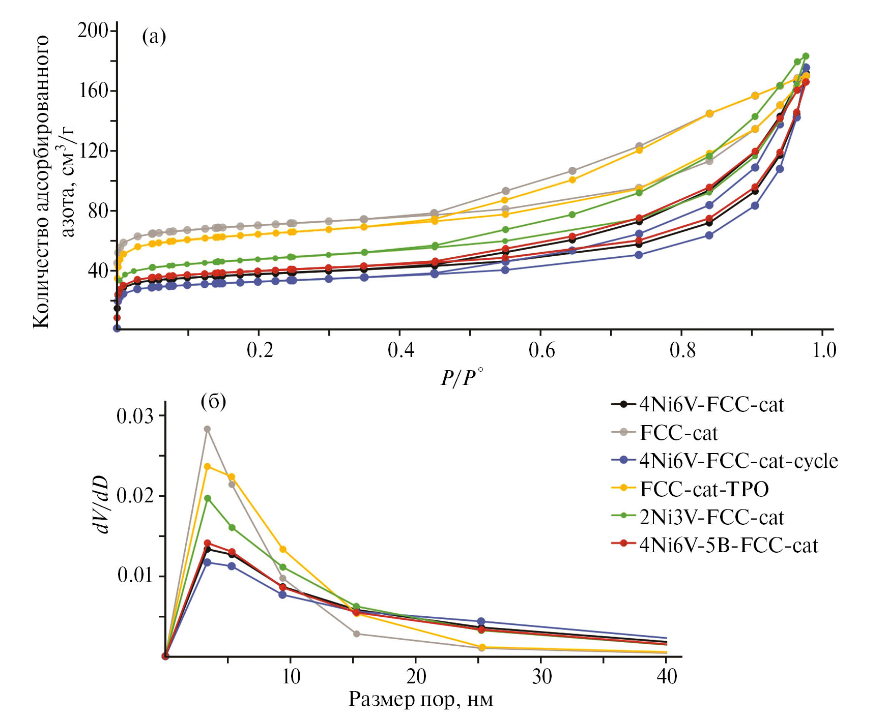 Рис. 1. Изотермы адсорбции–десорбции азота (а) и распределения пор по размерам (б) катализаторов: FCC-cat – свежий, FCC-cat-TPO – после термопаровой обработки, 2Ni3V-FCC-cat – после дезактивации 2000 ppm Ni и 3000 ppm V; 4Ni6V-FCC-cat – после дезактивации 4000 ppm Ni и 6000 ppm V; 4Ni6V-5B-FCC-cat – после пассивации 4000 ppm Ni и 6000 ppm V; 4Ni6V-FCC-cat-cycle – после дезактивации 4000 ppm Ni и 6000 ppm V и 5 циклов крекинг-регенерации