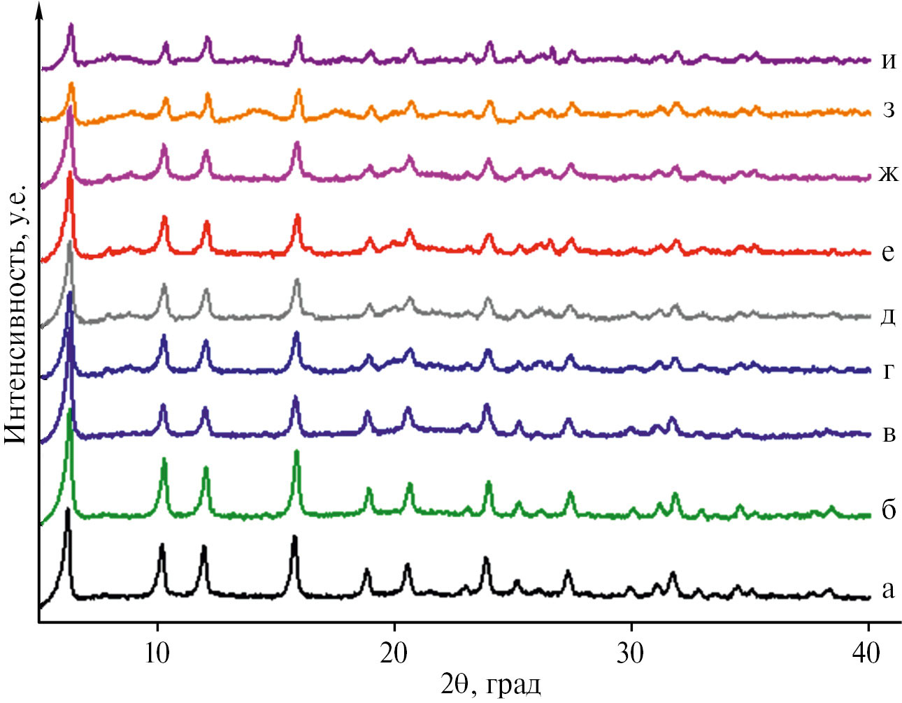 Рис. 2. Дифрактограммы промышленных катализаторов крекинга: а) свежий; б) после термопаровой обработки; в) после дезактивации 2000 ppm Ni и 3000 ppm V; г) после дезактивации 4000 ppm Ni и 6000 ppm V; д) после дезактивации 6000 ppm V; e) после пассивации 4000 ppm Ni и 6000 ppm V; ж) после пассивации 6000 ppm V; з) после дезактивации 4000 ppm Ni и 6000 ppm V и 5 циклов крекинг-регенерации; и) после пассивации 4000 ppm Ni и 6000 ppm V и пяти циклов крекинг-регенерации