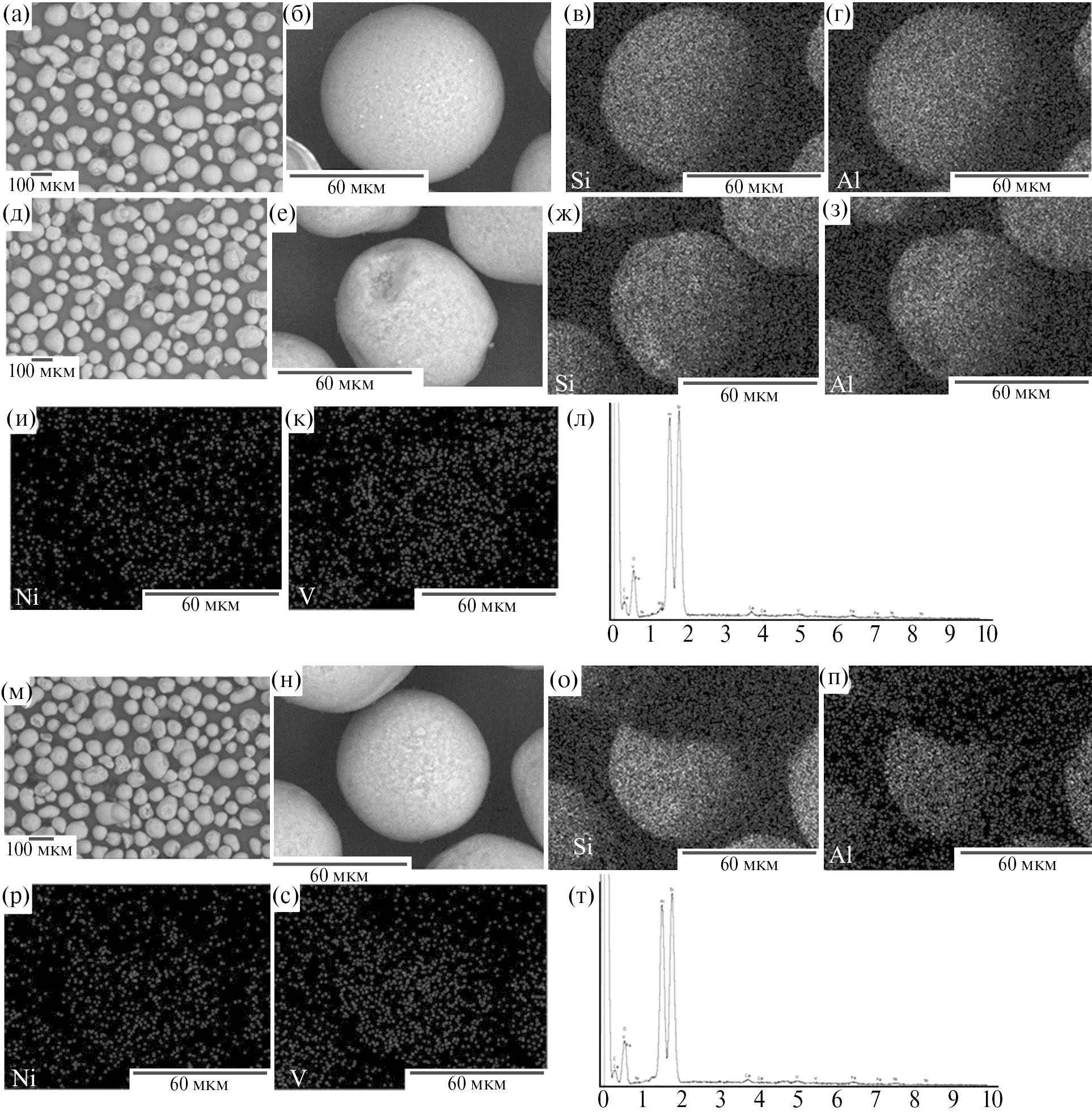 Рис. 3. СЭМ-изображения, элементное картирование и ЭДС-спектры катализаторов после термопаровой обработки (а, б) и (в, г), после дезактивации 4000 ppm Ni и 6000 ppm V (д, е), (ж, з, и, к) и (л), после пассивации 4000 ppm Ni и 6000 ppm V (м, н), (о, п, р, с) и (т) соответственно