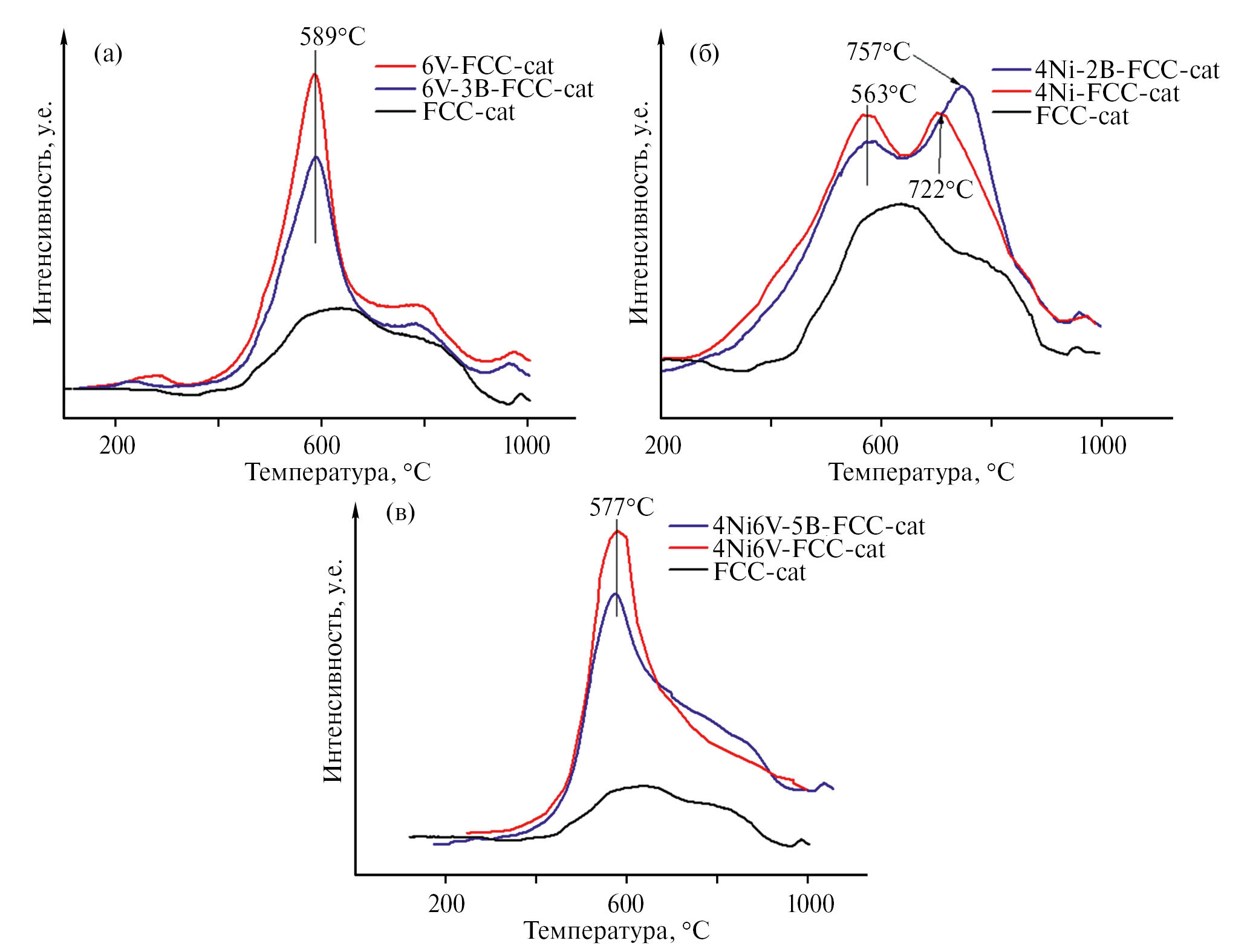 Рис. 4. Кривые температурно-программируемого восстановления водородом промышленных катализаторов крекинга: (а) после дезактивации и пассивации 6000 ppm V; (б) после дезактивации и пассивации 4000 ppm Ni; (в) после дезактивации и пассивации 4000 ppm Ni и 6000 ppm V