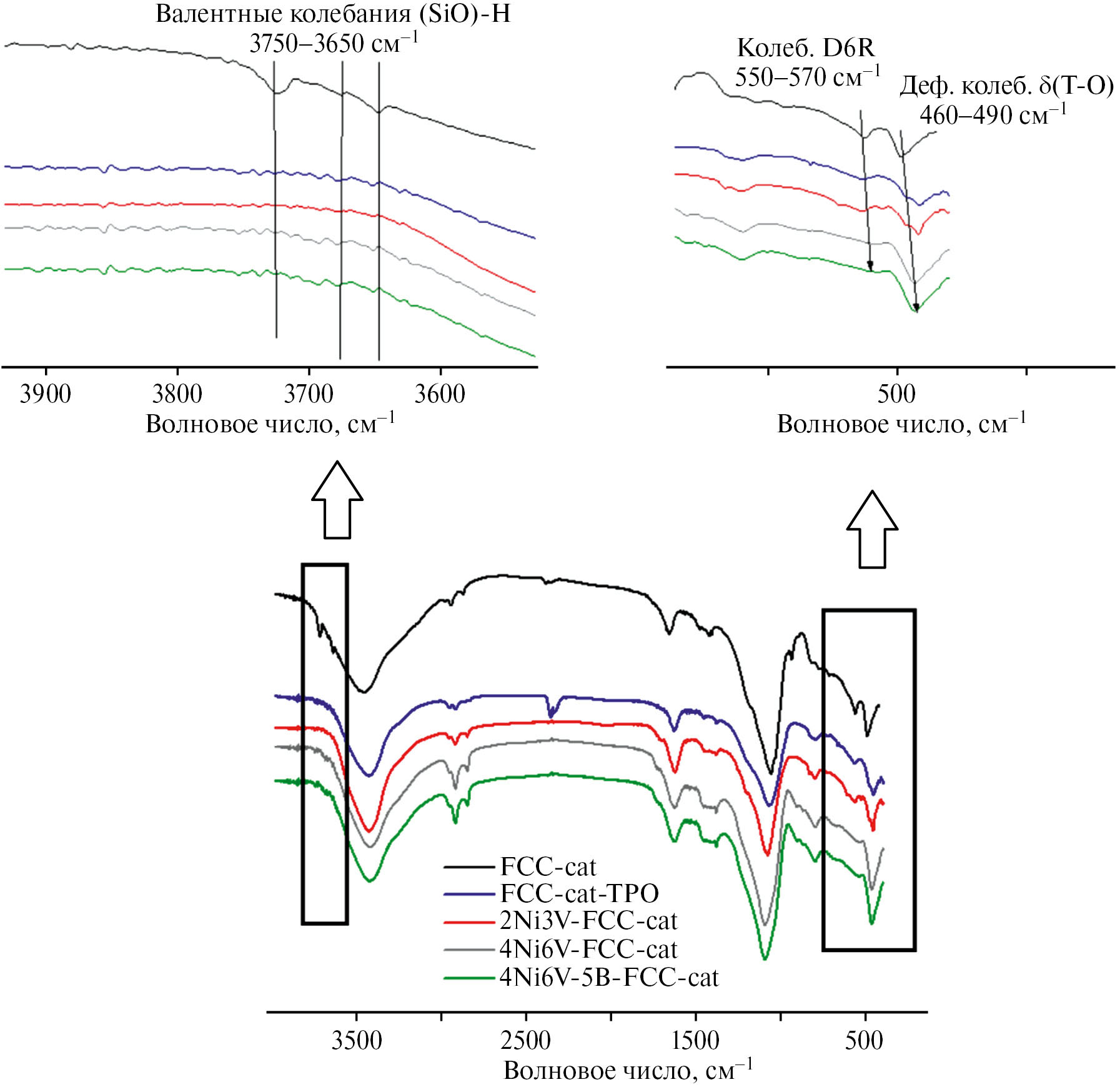 Рис. 5. ИК-спектры катализаторов крекинга: FCC-cat – свежий; FCC-cat-TPO – после термопаровой обработки; 2Ni3V-FCC-cat – после дезактивации 2000 ppm Ni и 3000 ppm V; 4Ni6V-FCC-cat – после дезактивации 4000 ppm Ni и 6000 ppm V; 4Ni6V-5B-FCC-cat – после пассивации 4000 ppm Ni и 6000 ppm V