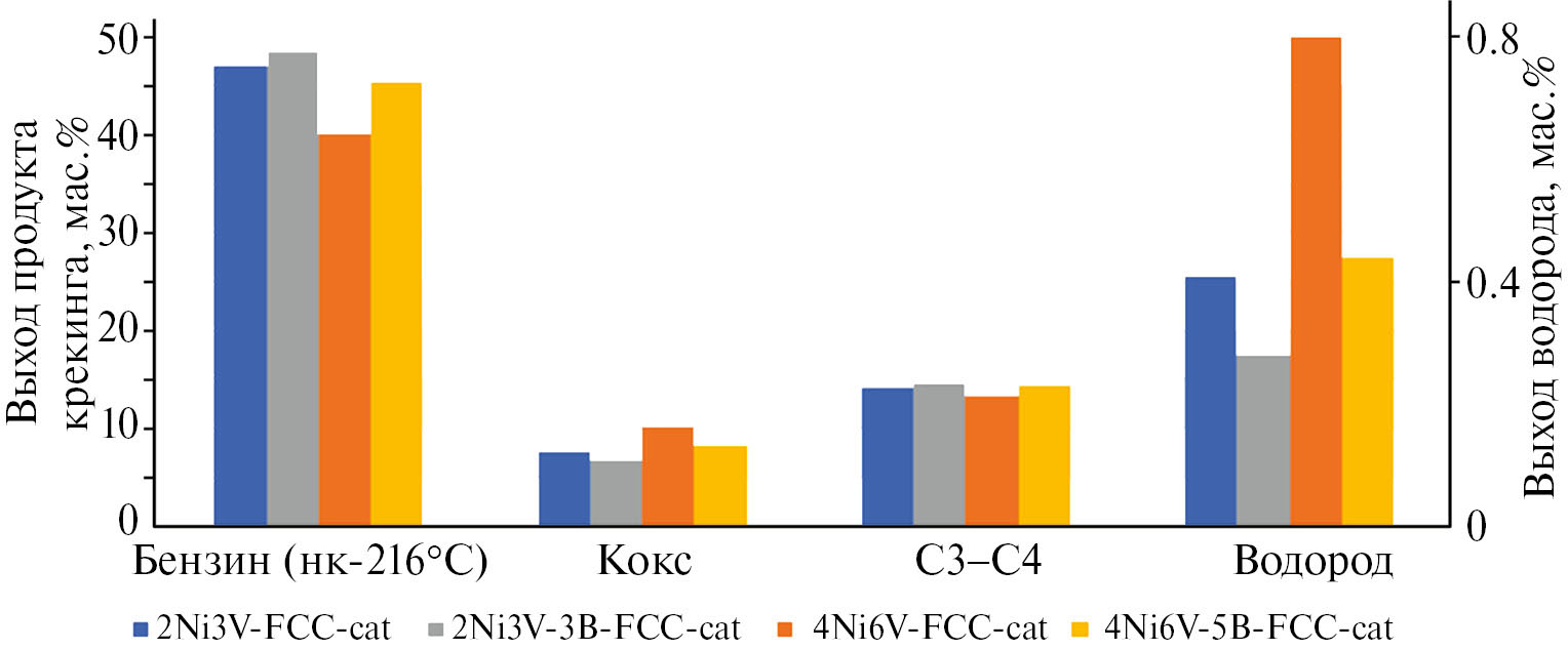 Исходя из оптимальных для наибольшей степени реактивации катализаторов соотношений никель/бор, определенных в работе [26], и ванадий/бор-пассиватор был нанесен на катализаторы, дезактивированные никелем и ванадием, 4Ni6V-FCC-cat и 2Ni3V-FCC-cat. При увеличении содержания никеля с 2000 до 4000 ppm и ванадия с 3000 до 6000 ppm происходит снижение выходов бензина и газов С3–С4 с 47.0 до 40.2 мас.% и с 14.1 до 13.4 мас.%, соответственно. Также при таком увеличении количества дезактивирующих металлов наблюдается увеличение выходов кокса и водорода на 34 и 51 отн.%. Пассивация никеля и ванадия на катализаторах крекинга способствовала частичному восстановлению каталитических свойств: для образцов 4Ni6V-FCC-cat и 2Ni3V-FCC-cat отмечались прирост выходов бензина на 5.1 и 1.9 мас.%, газов С3–С4 на 1.1 и 0.5 мас.%, снижение выходов кокса на 1.9 и 0.8 мас.%, водорода на 0.36 и 0.13 мас.%, соответственно (рис. 7). Эффект пассивации, выраженный в увеличении выходов бензина, газов С3–С4 и уменьшении выходов водорода и кокса, для образца 4Ni6V-FCC-cat значительно выше, чем у образца 6V-FCC-cat, содержащего приблизительно равное количество ванадия 6000 ppm без никеля, что косвенно подтверждает совместную пассивацию никеля и ванадия борсодержащей добавкой на катализаторе.