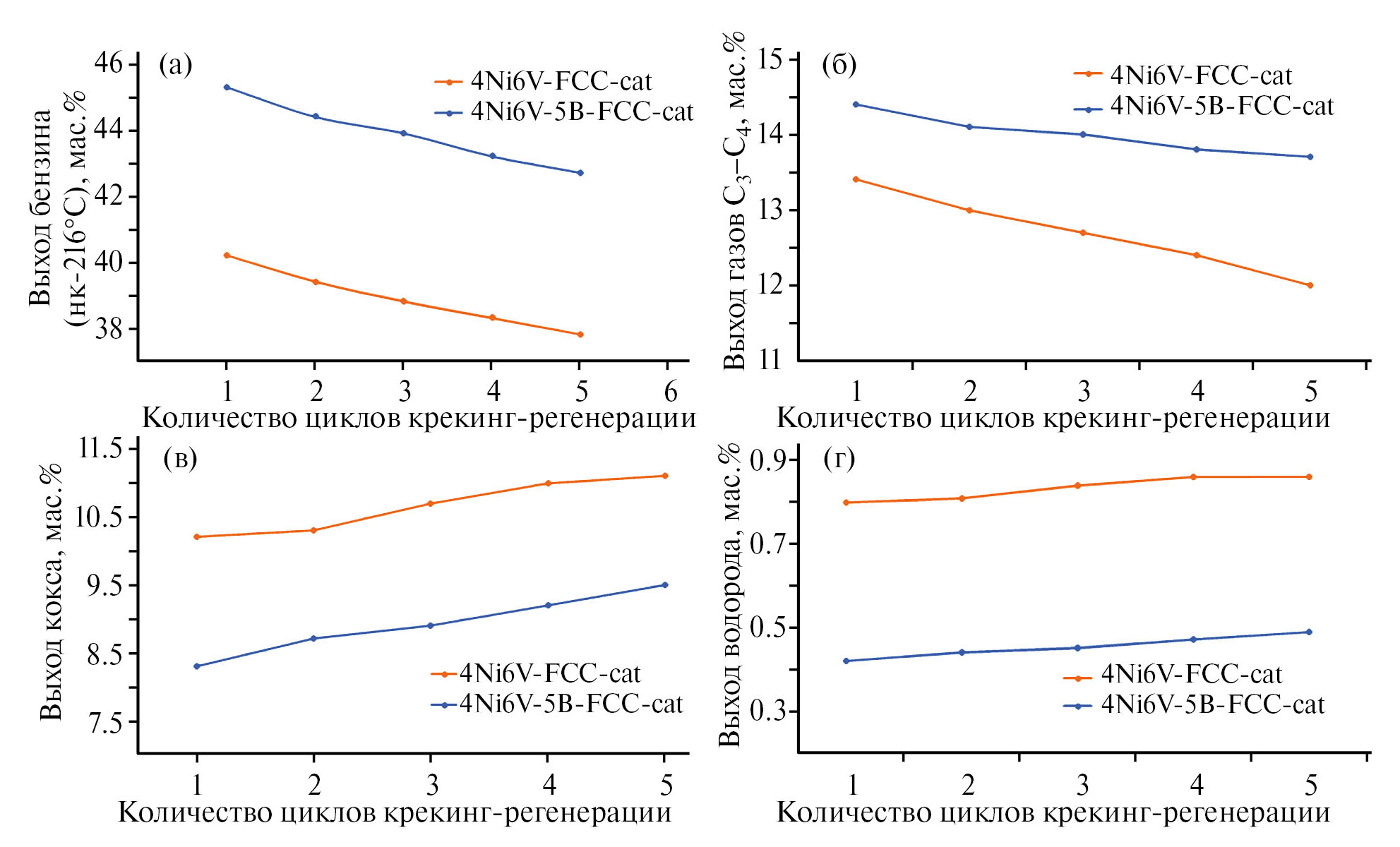 Для исследования стабильности эффекта пассивации металлов, выраженного в увеличении выходов бензина, газов С3–С4 и уменьшении выходов водорода и кокса, дезактивированный образец 4Ni6V-FCC-cat и катализатор после пассиваций 4Ni6V-5B-FCC-cat были испытаны в пяти циклах крекинга гидроочищенного вакуумного газойля с последующей регенерацией (рис. 8). Вне зависимости от наличия борсодержащего пассиватора на катализаторе с увеличением количества циклов крекинг–регенерации наблюдается уменьшение выходов бензина и газов С3–С4, увеличение выходов кокса и водорода, что свидетельствует о постепенной дезактивации катализатора, кроме того, скорости снижения активности катализаторов 4Ni6V-FCC-cat и 4Ni6V-5B-FCC-cat, выраженные в изменении выходов продуктов крекинга к количеству циклов крекинг–регенерации, приблизительно равны. Такое ухудшение каталитических свойств образцов объясняется разрушением цеолитного компонента катализатора ванадием в процессе циклов крекинг–регенерации, что согласуется с данными низкотемпературной адсорбции–десорбции азота и РФА. Несмотря на постепенную дезактивацию обоих катализаторов ванадием образец 4Ni6V-5B-FCC-cat после нанесения борсодержащего пассиватора обладал бо́льшей активностью на протяжении пяти циклов крекинг–регенерации, что может свидетельствовать о стабильном связывании никеля в пассивированном состоянии.