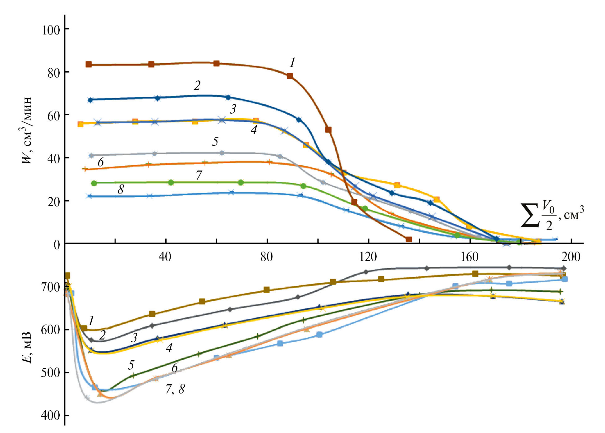 Рис. 1. Кинетические (выше оси абсцисс) и потенциометрические (ниже оси) кривые зависимости гидрирования смеси циклопентадиен–изопрен (100 : 100 см3 Н2) в этаноле на скелетных никелевых катализаторах из сплавов (m = 0.8 г) от среднего количества поглощенного водорода: 1) Ni–Al–Cu (30–60–10%); 2) Ni–Al–Ta (45–50–5%); 3) Ni–Al–Ag (48–50–2%); 4) Ni–Al–Тi–Mo (44–40–3–3%); 5) Ni–Al (50–50%); 6) Ni–Al–Cr (47–50–3%); 7) Ni–Al–Fe (45–50–5%); 8) Ni–Al–Ti–Cu (42–50–3–5%)