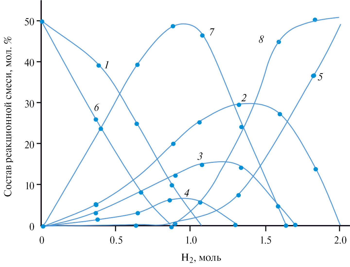 Рис. 2. Диаграмма состава катализата гидрирования смеси циклопентадиен–изопрен в этаноле (Ан2 = 200 см3) на скелетном никелевом катализаторе из сплава Ni–Al–Мо–Сr (44–50–3–3%): 1 – изопрен; 2 – b-изоамилен; 3 – g-изоамилен; 4 – a-изоамилен; 5 – изопентан; 6 – циклопентадиен; 7 – циклопентен; 8 – циклопентан (mсплава = 0.8 г, Vизопрен = 0.22 мл, Vциклопендиен = 0.19 мл, Топт = 20оС, РН2 = 0.1 МПа)