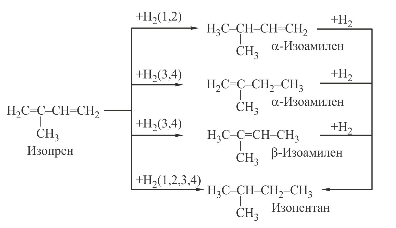 При поглощении 1 моля водорода изопрен полностью расходуется. Затем в реакцию вступает γ-изоамилен. Примечательно, что гидрирование изоамиленов сопровождает небольшой рост (5–10%) содержания β-изоамилена, что может быть обусловлено перемещением двойной связи вдоль углеродной цепи. β-изоамилен начинает гидрироваться, когда в реакционной смеси остается менее 4.5% γ-изоамилена и насыщается с очень малой скоростью. Конечным продуктом является изопентан. Изоамилены по реакционной способности распалагаются в следующем порядке: α-изоамилен > γ-изоамилен > β-изоамилен.