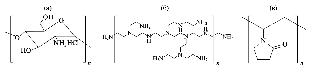 Рис. 1. Структура используемых азотсодержащих полимеров: ГХХ (а), ПЭИ (б) и ПВП (в).