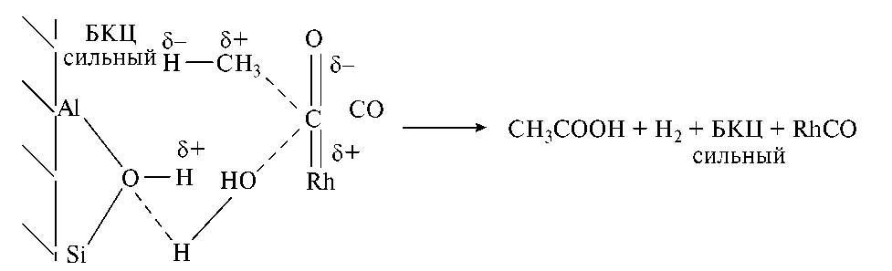 Как видно из табл. 3, все образцы проявляют достаточно высокую активность в образовании оксигенатов (метанол и УК). При этом, как выход оксигенатов, так и соотношение УК/метанол приблизительно одинаковы для исследуемых цеолитов. Модифицирование родием приводит к значительному повышению выхода оксигенатов, главным образом за счет роста выхода УК. При этом на образце Rh/ИК-17 (УЗО) выход УК увеличивается более чем на порядок и существенно возрастает соотношение УК/метанол от 1.2 до 24.7. Значительное увеличение выхода УК на родийсодержащих цеолитах, по всей видимости, связано с синергизмом действия сильных БКЦ и одноатомных родиевых центров. С ростом концентрации сильных БКЦ и дисперсности родиевых центров увеличивается вероятность их близкого взаимного расположения. Предполагается, что близкое расположение сильных БКЦ и карбонила родия способствует образованию УК (рис. 2). Такое взаимодействие легко происходит при высокодисперсном распределении одноатомного родия и высокой концентрации сильных БКЦ, что в большей степени наблюдается для образца Rh/ИК-17.